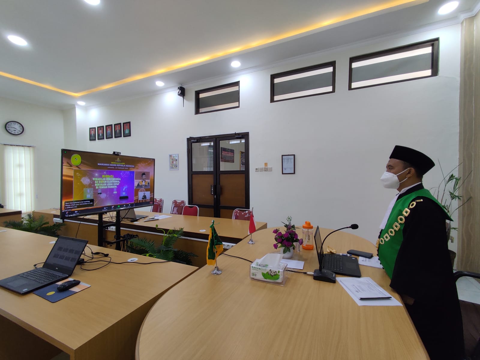 Selasa, 22 Februari 2022 – Ketua Pengadilan Agama Pemalang, Drs. H. Asrori, S.H., M.H. menghadiri acara Sidang Istimewa Laporan Tahunan Mahkamah Agung RI Tahun 2021 secara virtual dari Ruang Media Center Pengadilan Agama Pemalang. Acara tahunan kali ini diselenggarakan secara virtual karena masih dalam masa pandemi Covid-19, kegiatan tersebut diadakan langsung dari Gedung Mahkamah Agung RI di Jakarta dengan menerapkan protokol kesehatan yang ketat. Sidang Istimewa Laporan Tahunan Mahkamah Agung RI Tahun 2021 mengangkat tema ” Akselerasi Perwujudan Peradilan Modern”.