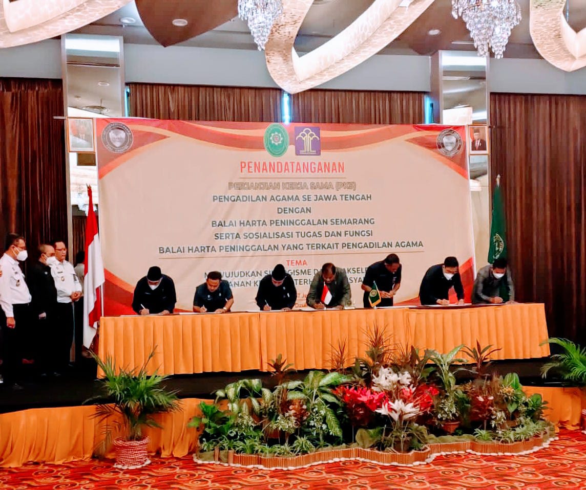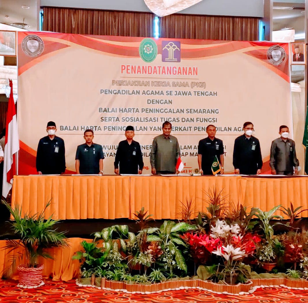 Semarang, 27 Juli 2022. Hari ini bertempat di Quest Hotel Semarang, dilaksanakan Penandatanganan Perjanjian Kerjasama (PKS) antara Pengadilan Agama se-Jawa Tengah dengan Balai Harta Bersama (BHP) Semarang. Acara dilaksanakan mulai pukul 08.30 WIB. Sebagai wakil dari Pengadilan Agama Pemalang hadir dalam acara tersebut Ketua Pengadilan Agama Pemalang Drs. H. Asrori, S.H., M.H. beserta Panitera Afif Eko Sulistiono, S.H. dan Sekretaris Mulyatun, S.H. Acara diselenggarakan oleh Pengadilan Tinggi Agama Semarang dengan tetap mematuhi protokol kesehatan pencegahan/penyebaran Covid-19. (yip)
