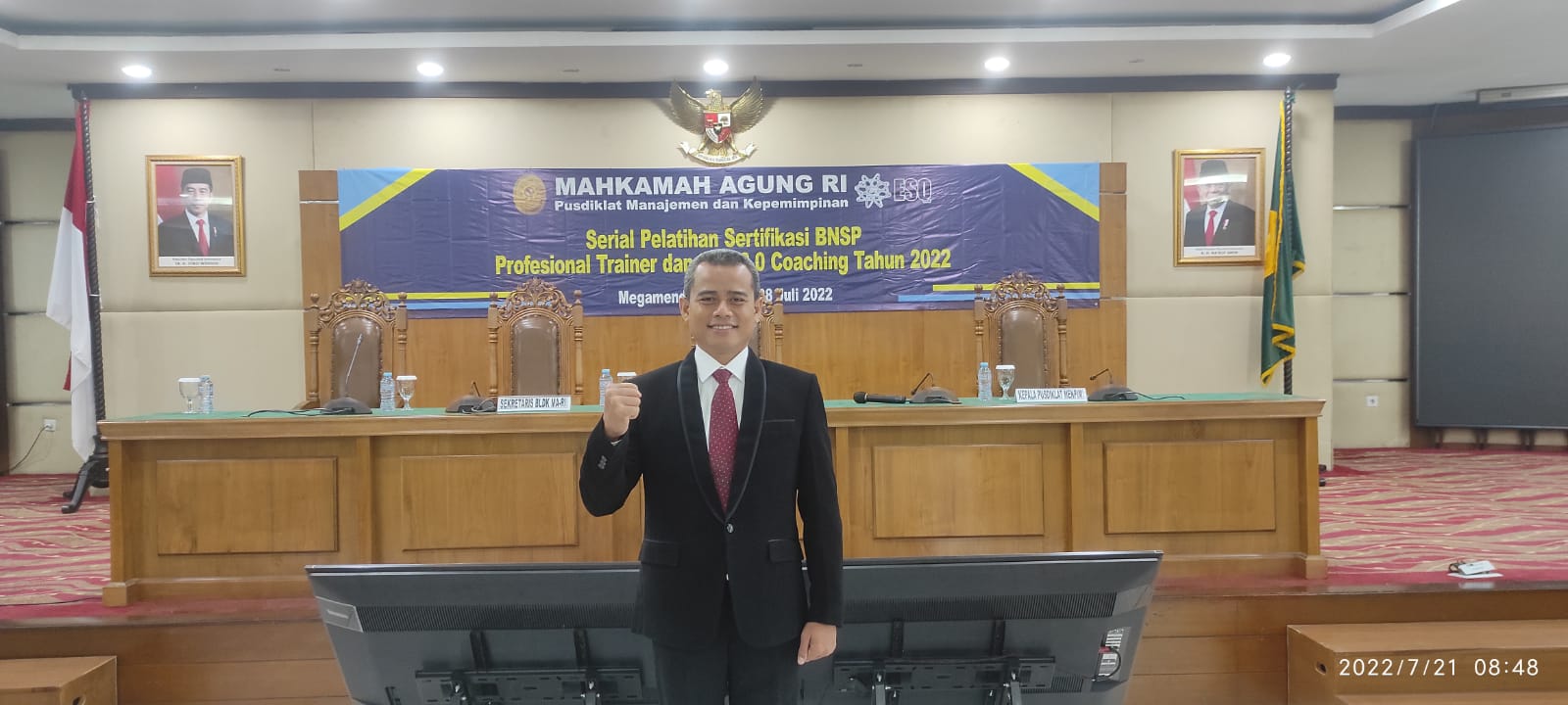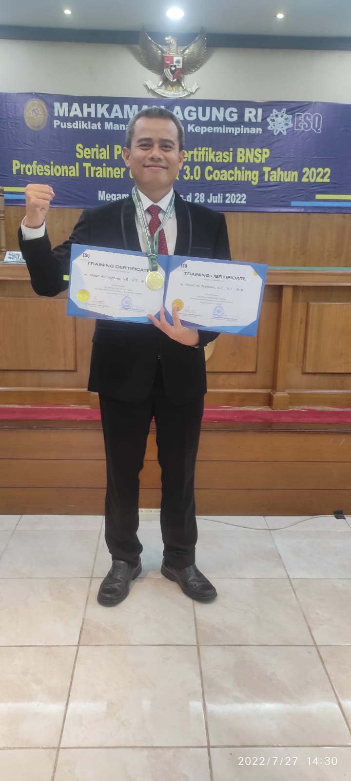 Pemalang, 28 Juli 2022 – Kasubag PTIP Pengadilan Agama Pemalang H. Ahmad Ali Syahbana, S.E., S.T., M.M. dinyatakan lulus dan kompeten dalam pendidikan dan latihan (Diklat) Sertifikasi Profesional Trainer dan ESQ 3.0 Coaching Tahun 2022 yang dilaksanakan oleh Pusat Pendidikan dan Latihan Manajemen Kepemimpinan (pusdiklatmenpim) Mahkamah Agung RI.