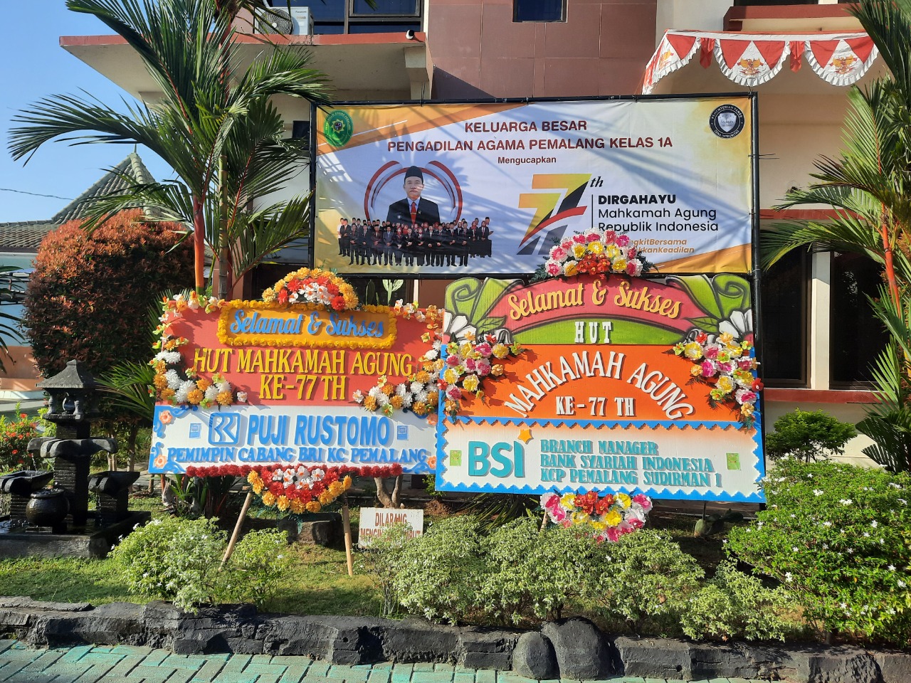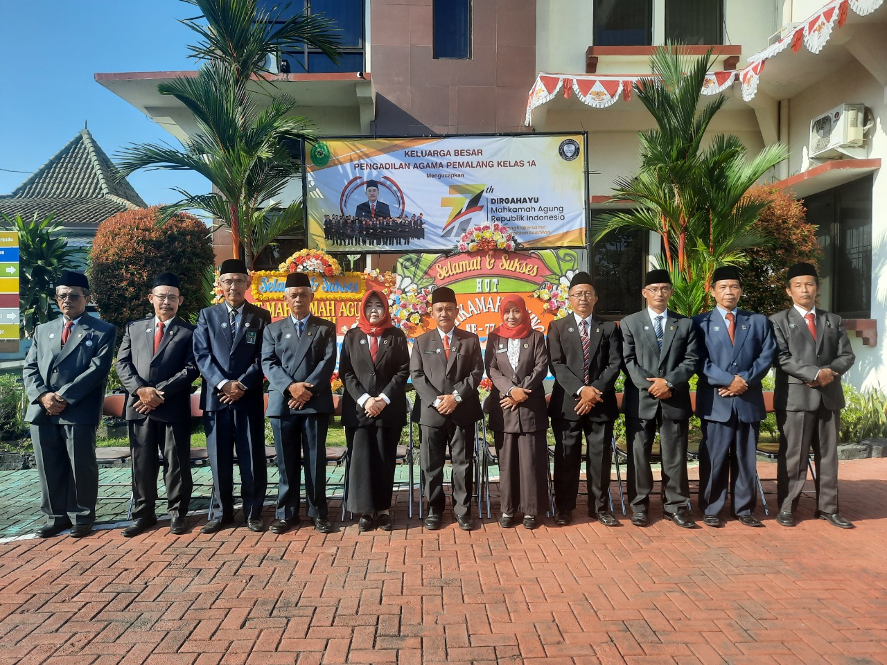 Pemalang, 19 Agustus 2022 – Dalam rangka memperingati Hari Ulang Tahun (HUT) Mahkamah Agung Republik Indonesia ke 77 tahun 2022, hari ini Pengadilan Agama Pemalang Kelas 1A menyelenggarakan upacara bendera dan tasyakkuran yang dilaksanakan mulai pukul 07.30 WIB. Hadir sebagai pembina upacara, Yang Mulia Ketua Pengadilan Agama Pemalang Drs. H. Asrori, S.H., M.H. Upacara ini diikuti oleh seluruh Hakim, ASN dan tenaga kontrak Pengadilan Agama Pemalang. Adapun tema HUT Mahkamah Agung ke-77 ini adalah “Bangkit Bersama, Tegakkan Keadilan”. Tema tersebut merupakan wujud kesadaran dan komitmen bersama, untuk menata ulang kehidupan yang lebih baik, sekaligus menjadi momentun untuk dapat menyatukan kembali tekad dan semangat kebersamaan dalam meraih cita-cita, bagi terwujudnya lembaga Peradilan yang Agung dan Modern. Dalam upacara ini Drs. H. Asrori, S.H., M.H. membacakan pidato dari Ketua Mahkamah Agung RI Prof. Dr. H.M. Syarifuddin, S.H., M.H. Upacara ditutup dengan foto bersama para hakim dan juga seluruh pegawai Pengadilan Agama Pemalang Kelas 1A.