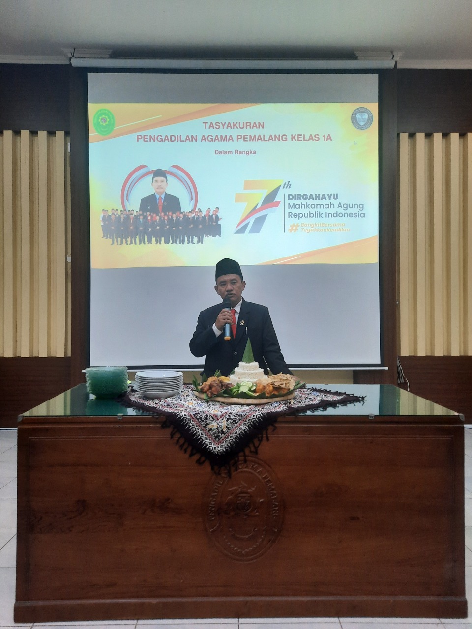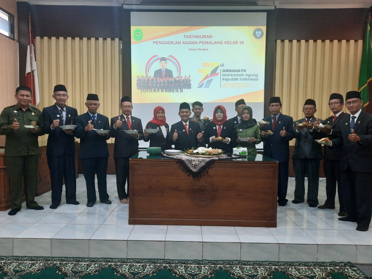 Acara dilanjutkan dengan tasyakkuran yang dilaksanakan di Ruang Sidang Abu Bakar As Shiddiq yang diikuti oleh seluruh pegawai Pengadilan Agama Pemalang. Acara dibuka dengan menyanyikan lagu Indonesia Raya dan Hymne Mahkamah Agung. Dilanjutkan dengan sambutan dan pemotongan tumpeng yang dibagikan kepada beberapa pegawai sebagai perwakilan oleh Ketua Pengadilan Agama Pemalang Drs. H. Asrori, S.H., M.H. Acara ditutup dengan penyerahan hadiah kepada pemenang lomba-lomba yang telah dilaksanakan dari hari Senin tanggal 15 Agustus 2022 hingga Kamis 18 Agustus 2022 dalam rangka untuk memeriahkan HUT RI ke 77 dan HUT Mahkamah Agung RI ke 77. (yip)