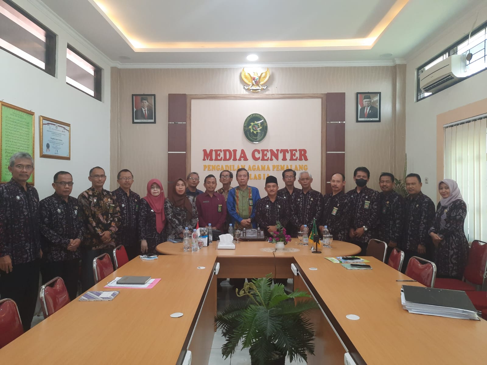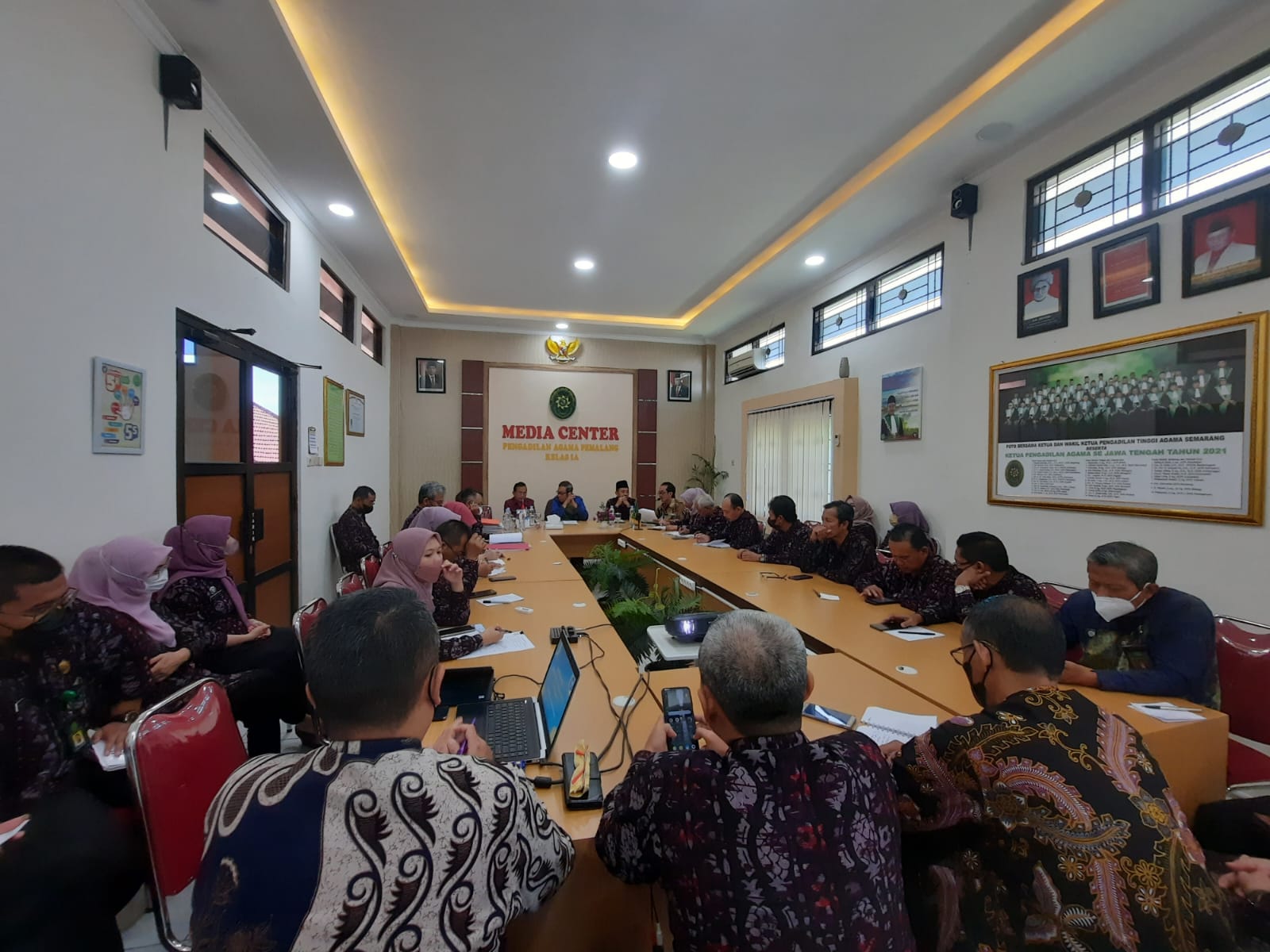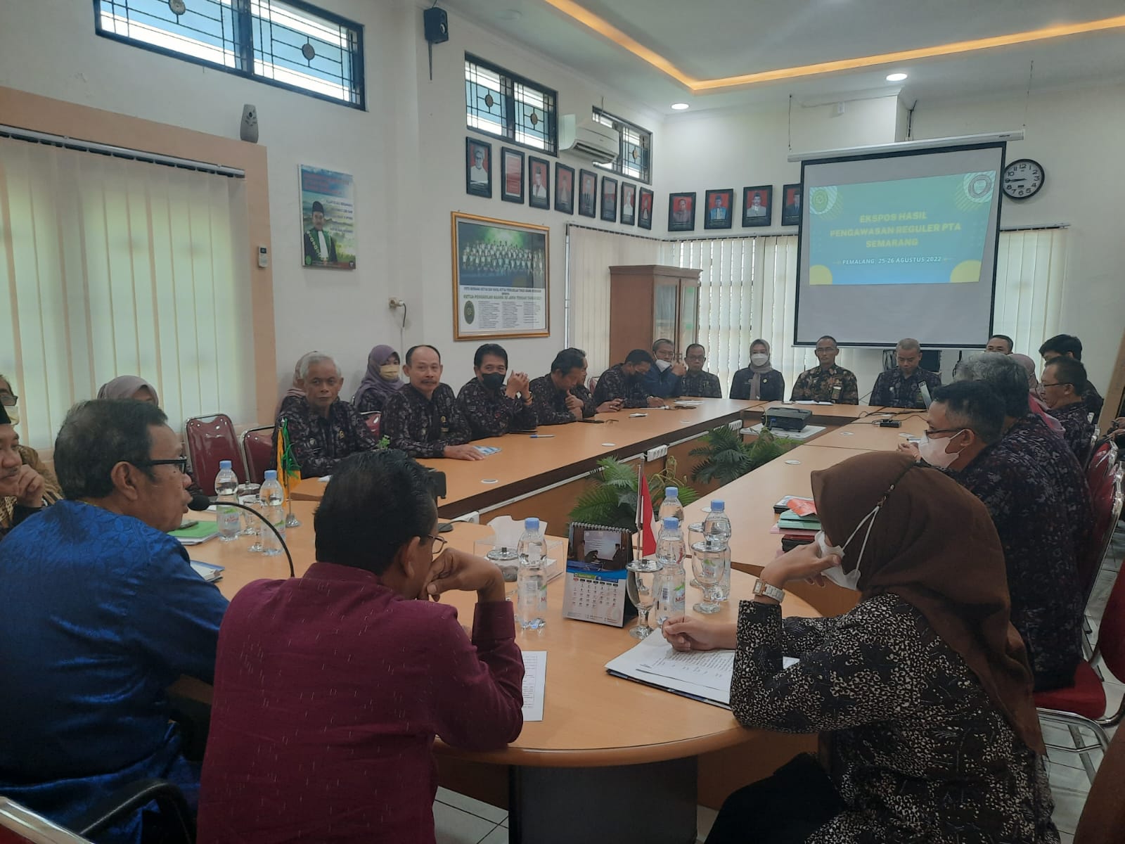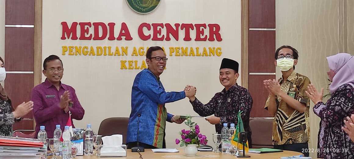 Pemalang, 26 Agustus 2022. Pengadilan Agama Pemalang Kelas 1A pada hari Kamis 25 Agustus 2022 mendapatkan kunjungan dari Hakim Tinggi Pengawas Daerah Pengadilan Tinggi Agama Semarang. Kunjungan kali ini dalam rangka Pengawasan dan Pembinaan Reguler di Pengadilan Agama Pemalang Kelas IA. Tim pengawas tersebut yaitu Drs. H. A. Agus Bahauddin, M.Hum Hakim Pengadilan Tinggi Agama Semarang sebagai ketua tim, Drs. Syaifullah, S.H., M.H. Panitera Muda Hukum Pengadilan Tinggi Agama Semarang sebagai anggota tim, Drs. Setya Adi Winarko, S.H., M.H. Panitera Pengganti Pengadilan Tinggi Agama Semarang sebagai anggota tim, dan Nila Yudawati, S.H. Kasubbag Kepegawaian dan TI Pengadilan Tinggi Agama Semarang sebagai anggota tim. Pengawasan dilaksanakan mulai dari pukul 08.30 WIB hingga pukul 16.30 WIB. Hari ini [26/8] pukul 08.30 WIB dilaksanakan expose meeting yang membahas hasil dari pemeriksaan yang telah dilaksanakan di hari sebelumnya di Ruang Media Center Pengadilan Agama Pemalang yang diikuti oleh seluruh hakim, pejabat struktural, dan fungsional, serta pegawai ASN dan non ASN Pengadilan Agama Pemalang Kelas 1A.