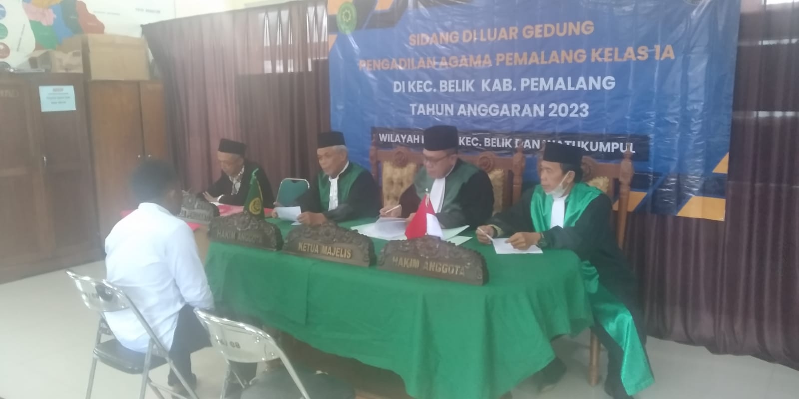 Pemalang, 27 Januari 2023. Mengawali tahun 2023 Pengadilan Agama Pemalang melaksanakan kegiatan sidang keliling. Sidang keliling adalah sidang yang dilaksanakan di luar gedung pengadilan yang di peruntukan bagi masyarakat yang mengalami hambatan untuk datang ke kantor pengadilan karena alasan jarak, transportasi dan biaya. Ini merupakan salah satu bentuk pelayanan yang diberikan oleh Pengadilan Agama Pemalang kepada masyarakat. Sidang keliling dimulai hari ini [27/01] dan untuk tahun anggaran 2023 akan dilaksanakan di dua tempat yaitu di Kecamatan Belik dan Kecamatan Moga masing-masing akan dilaksanakan delapan kali kegiatan.