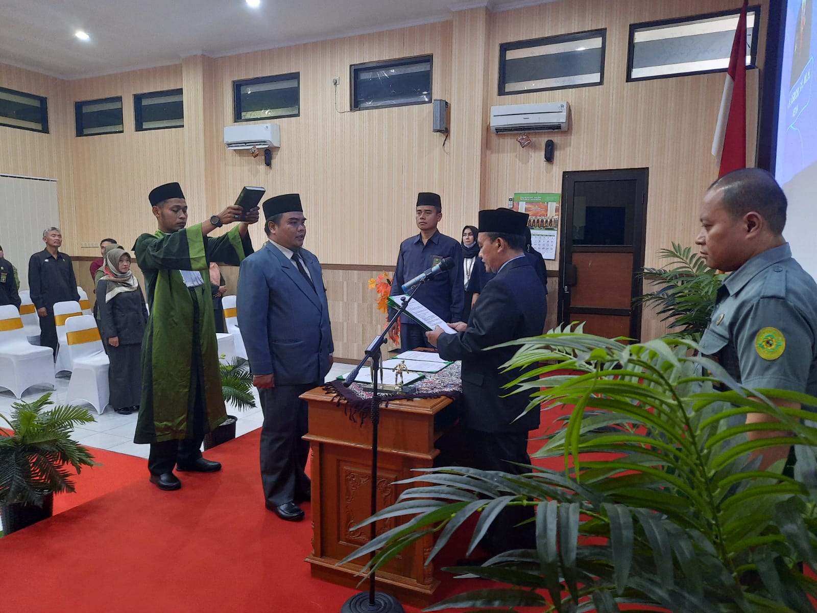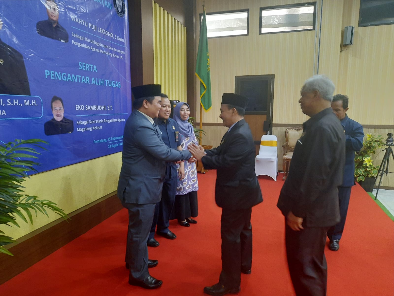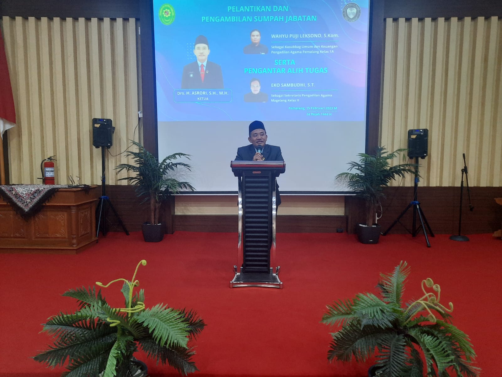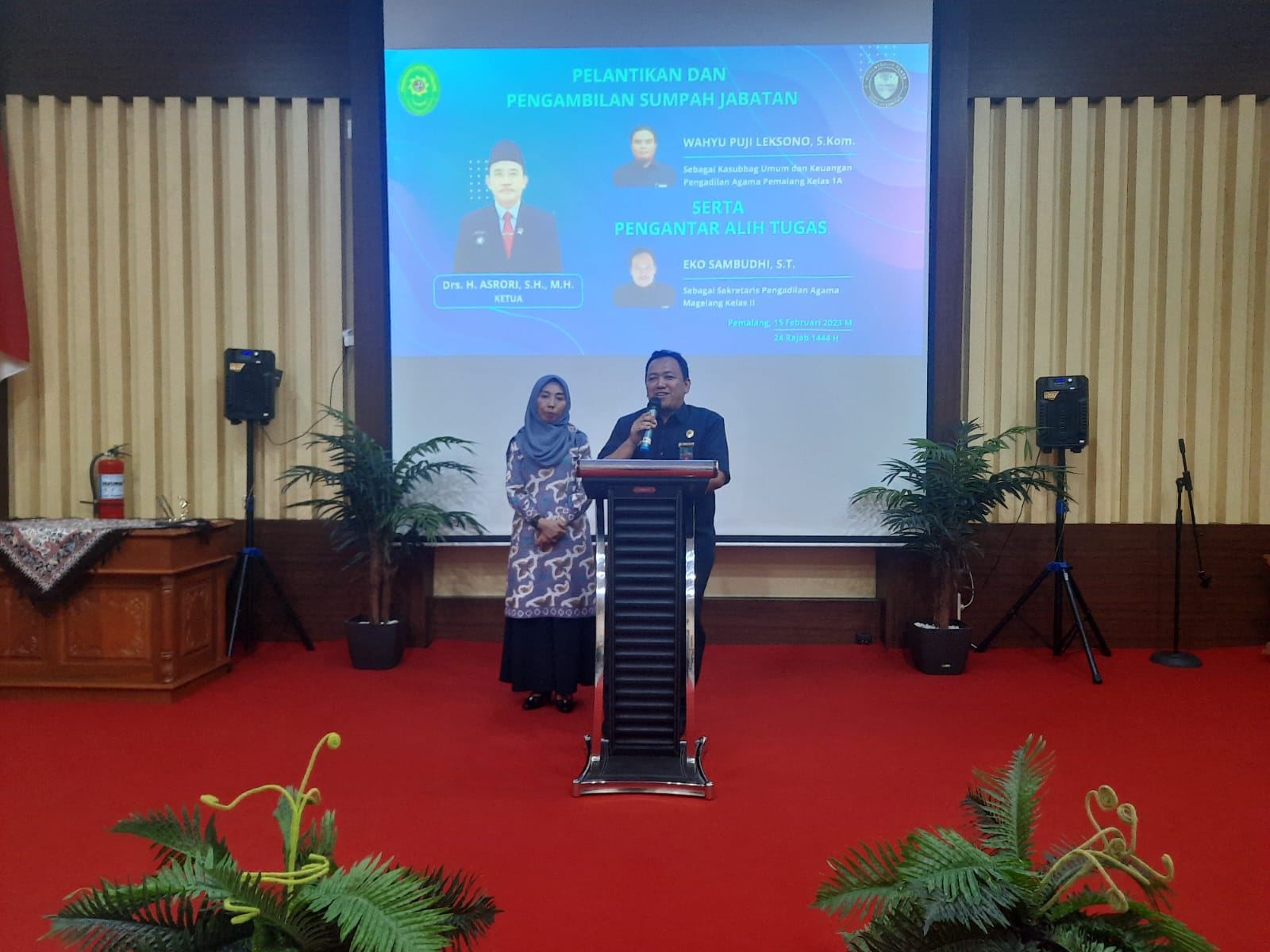 Pemalang, 15 Februari 2023. Siang hari ini Pengadilan Agama Pemalang Kelas 1A menyelenggarakan acara Pelantikan, dan Pengambilan Sumbah Jabatan Kepala Sub Bagian Umum & Keuangan, serta Pengantar Alih Tugas pegawai menjadi Sekretaris PA Magelang di Ruang Sidang Abu Bakar As Shiddiq. Acara ini dimulai pada pukul 13.30 WIB dan dihadiri oleh jajaran pimpinan, para hakim, pejabat struktural dan fungsional, pegawai Pengadilan Agama Pemalang, tamu undangan serta keluarga Kasubbag yang dilantik.