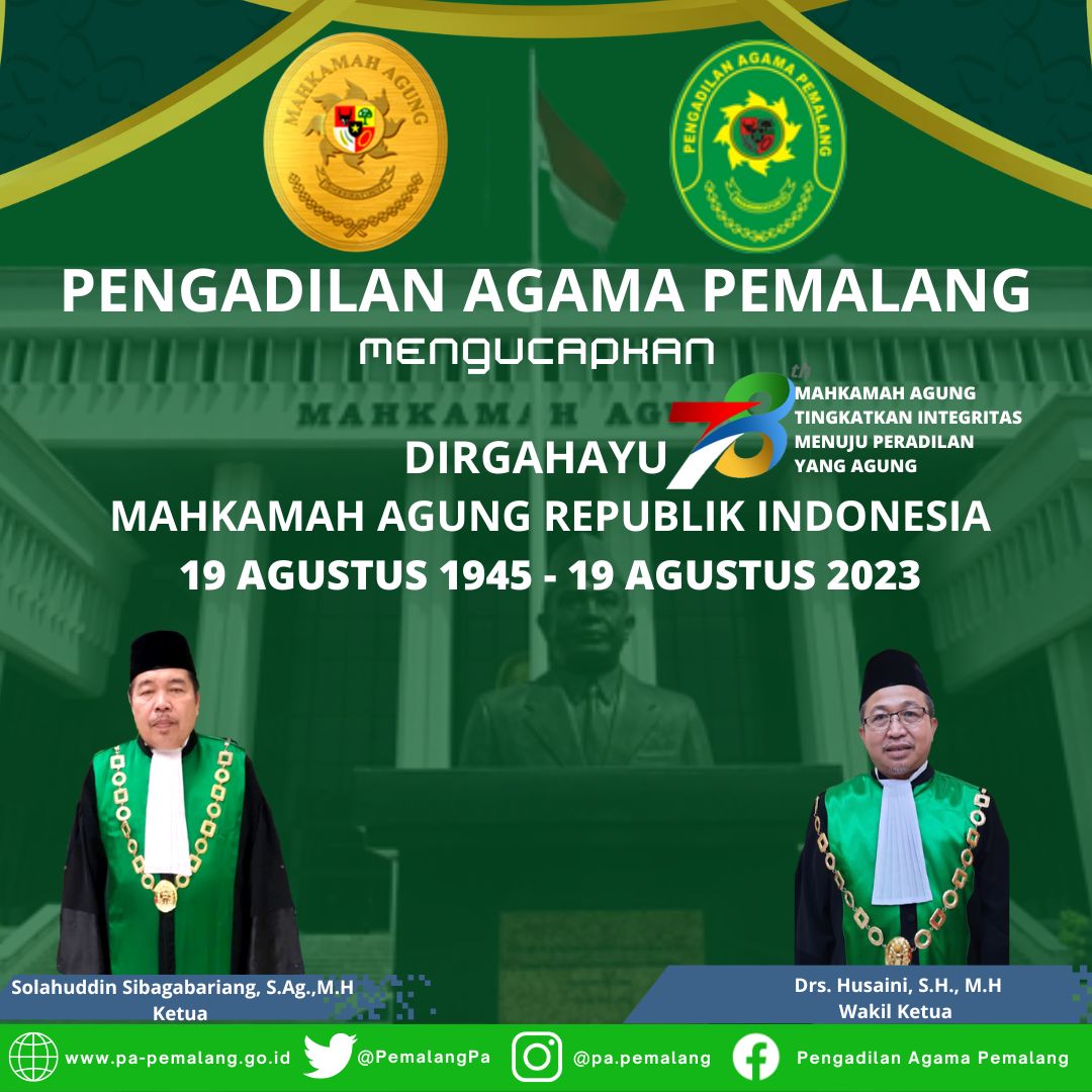 Pemalang, 19 Agustus 2023, Segenap keluarga Besar Pengadilan Agama Pemalang mengucapkan Dirgahayu Mahkamah Agung Ke 78. “Mahkamah Agung Tingkatkan Integritas Menuju Peradilan Yang Agung”.
