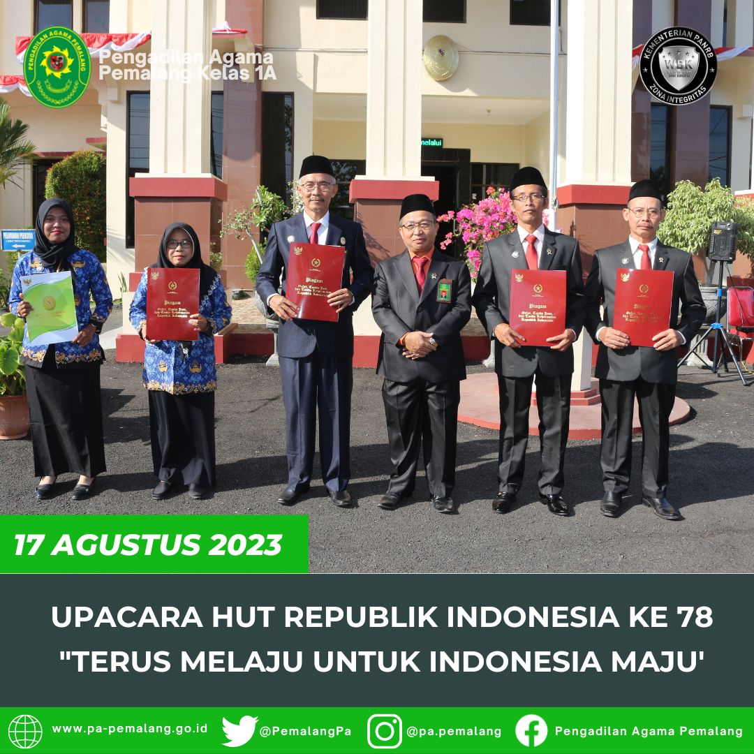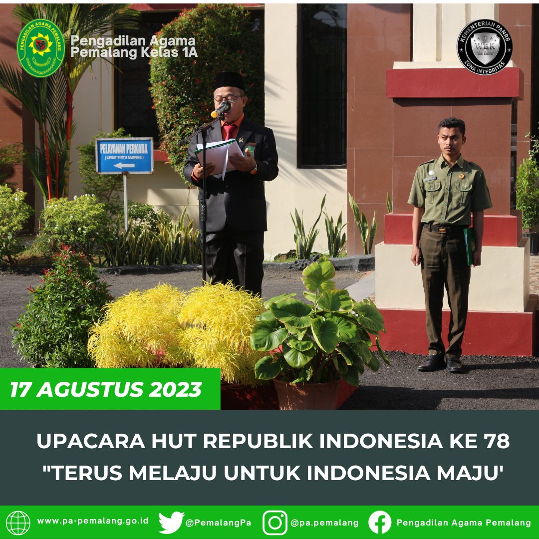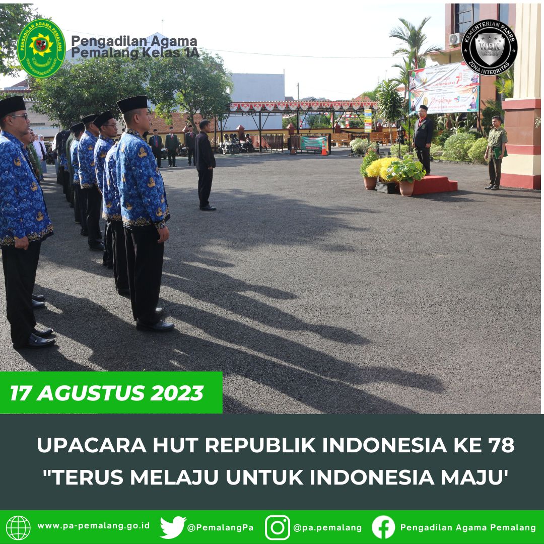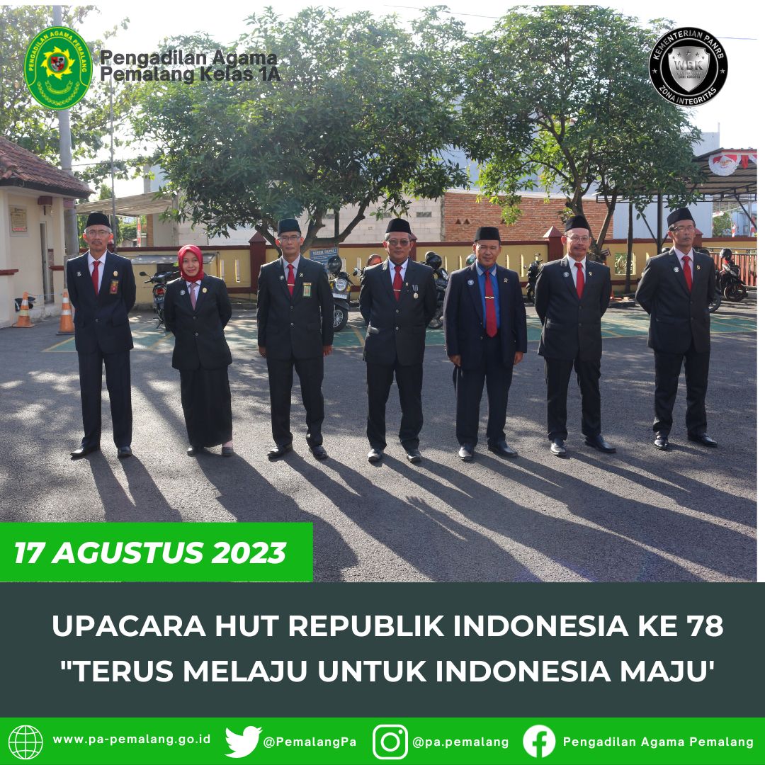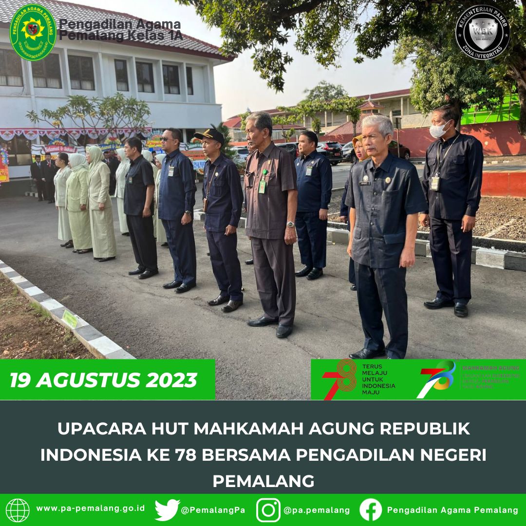 Pemalang 19 Agustus 2023, Bertempat di depan Halaman Kantor Pengadilan Negeri Pemalang, Seluruh Pegawai Pengadilan Agama Pemalang dan Pengadilan Negeri Pemalang dengan Hikmat mengikuti Upacara HUT Mahkamah Agung Republik Indonesia ke 78.