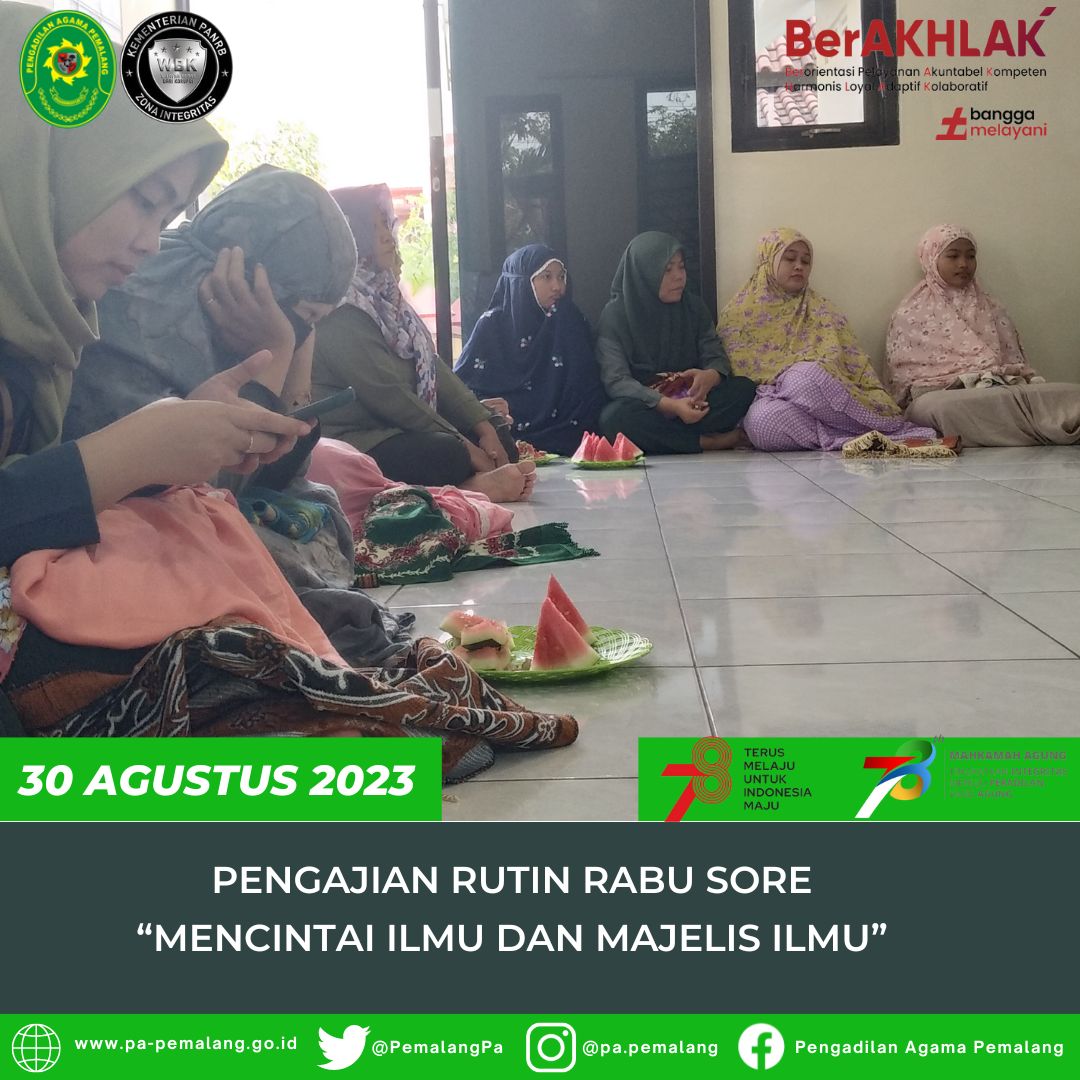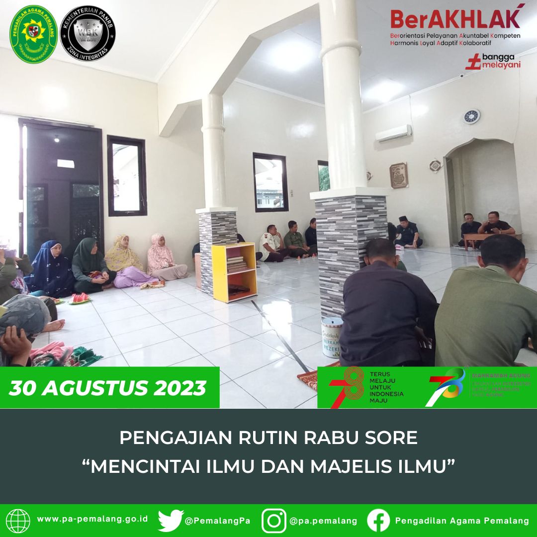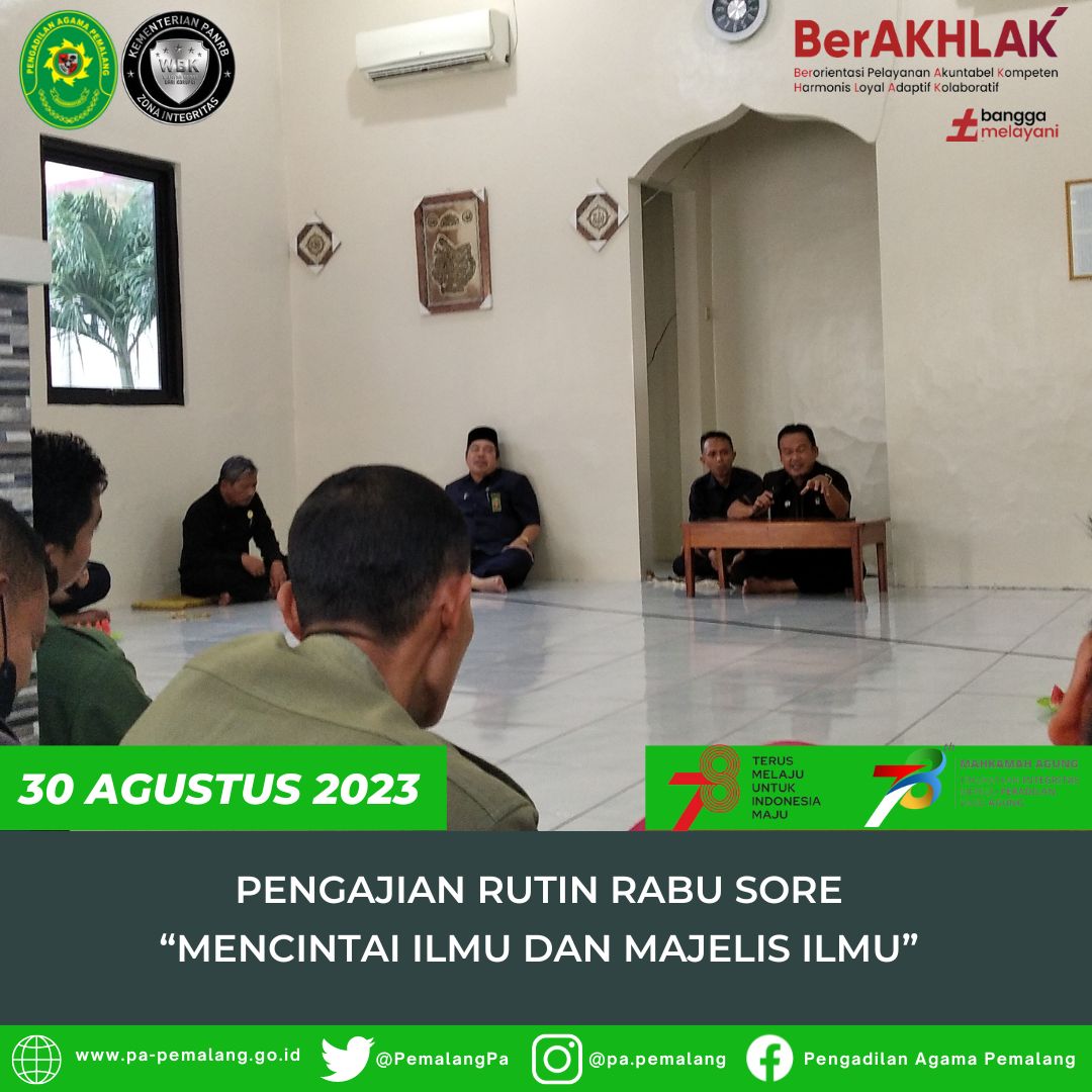 Pengajian Rutin Rabu Sore di Mushola Al Mahkamah kali ini di isi oleh Hakim Pengadilan Agama Pemalang Drs. H. Abd. Hamid, S.H.,M.H yang mengambil Tema tentang bagaimana kita mencintai ilmu dan juga mencintai majelis ilmu untuk bekal kita dalam menjalani kehidupan agar menjadi mukmin yang berkhlak