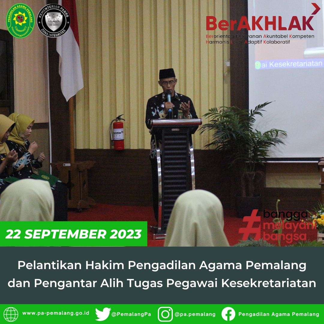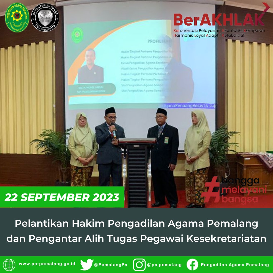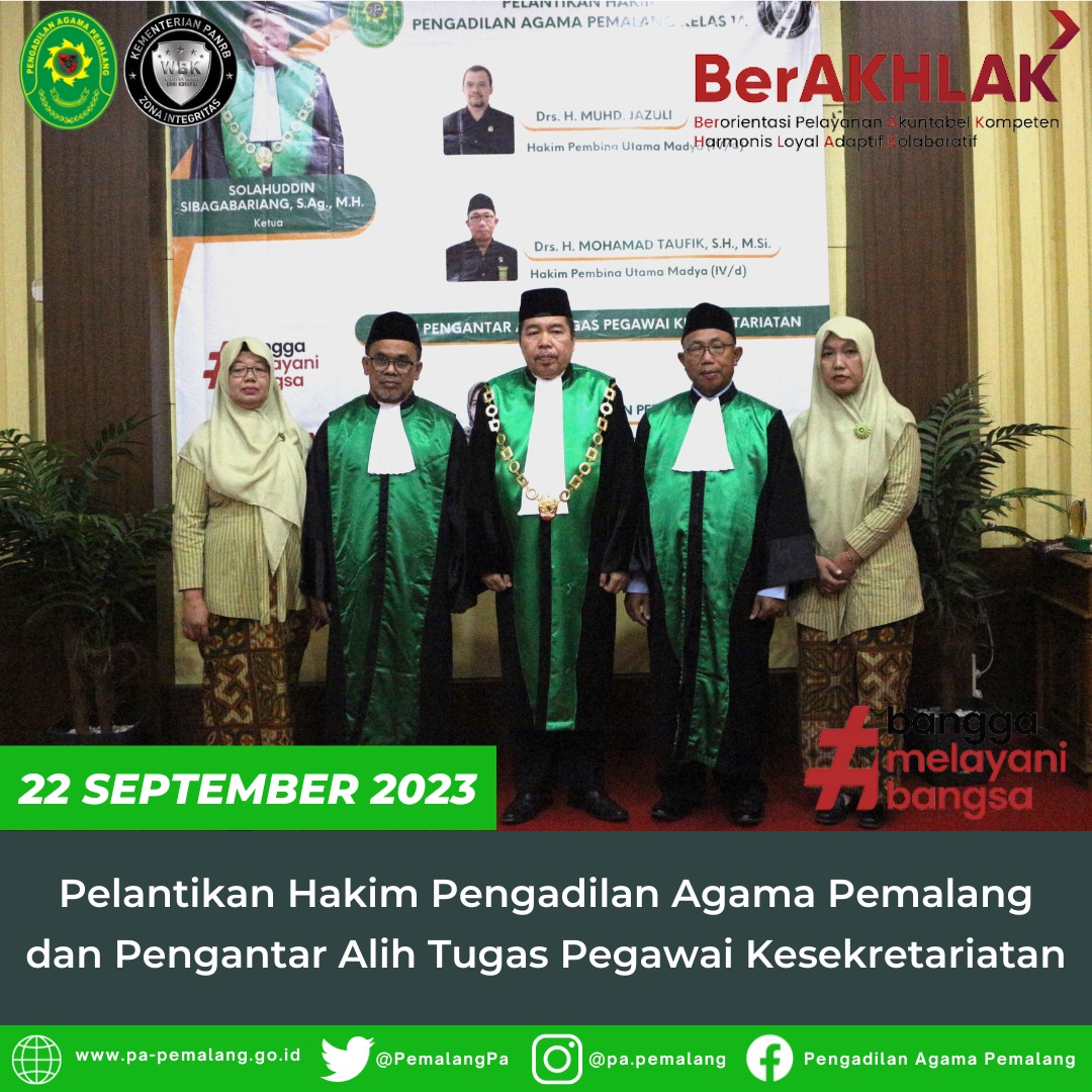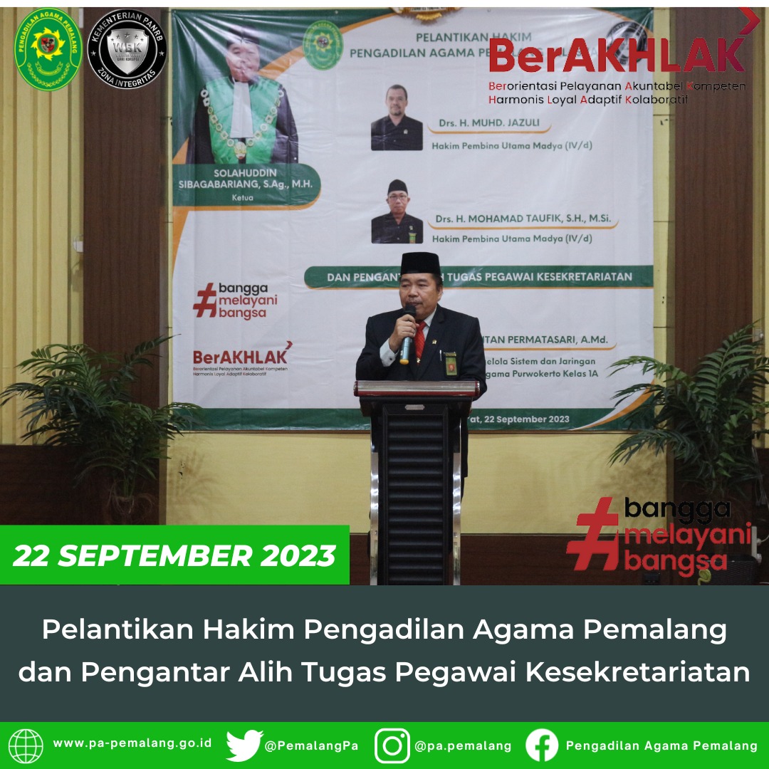 Bertempat di Ruang Sidang Utama Abu Bakar Ash Shidiq pukul 9.30 di laksanakan Pelantikan Hakim Pengadilan Agama Pemalang Drs. H. MUHD. JAZULI dan Drs. H. MOHAMAD TAUFIK, S.H.,M.Si. serta Pengantar Alih Tugas Pegawai Kesekretariatan Yulita Intan Permatasari, A.Md.