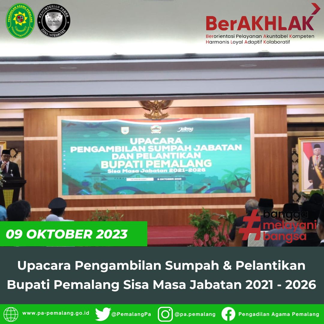 Ketua Pengadilan Agama Pemalang, Solahuddin Sibagabariang, S.Ag.,M.H. menghadiri upacara pengambilan sumpah jabatan dan pelantikan Bupati Pemalang, Bapak H. Mansur Hidayat, S.T sebagai Bupati Pemalang sisa masa jabatan 2021 – 2026.