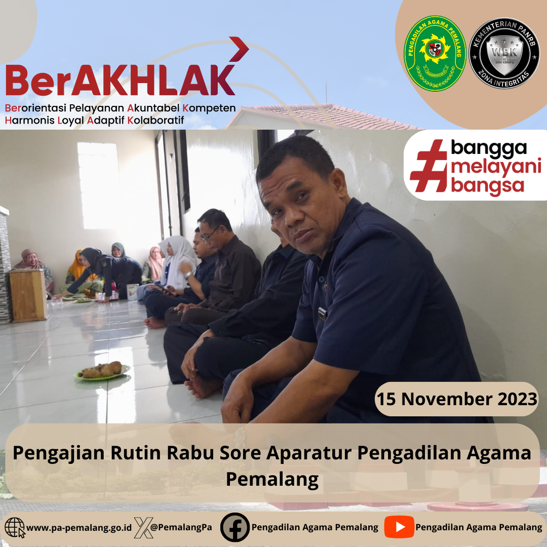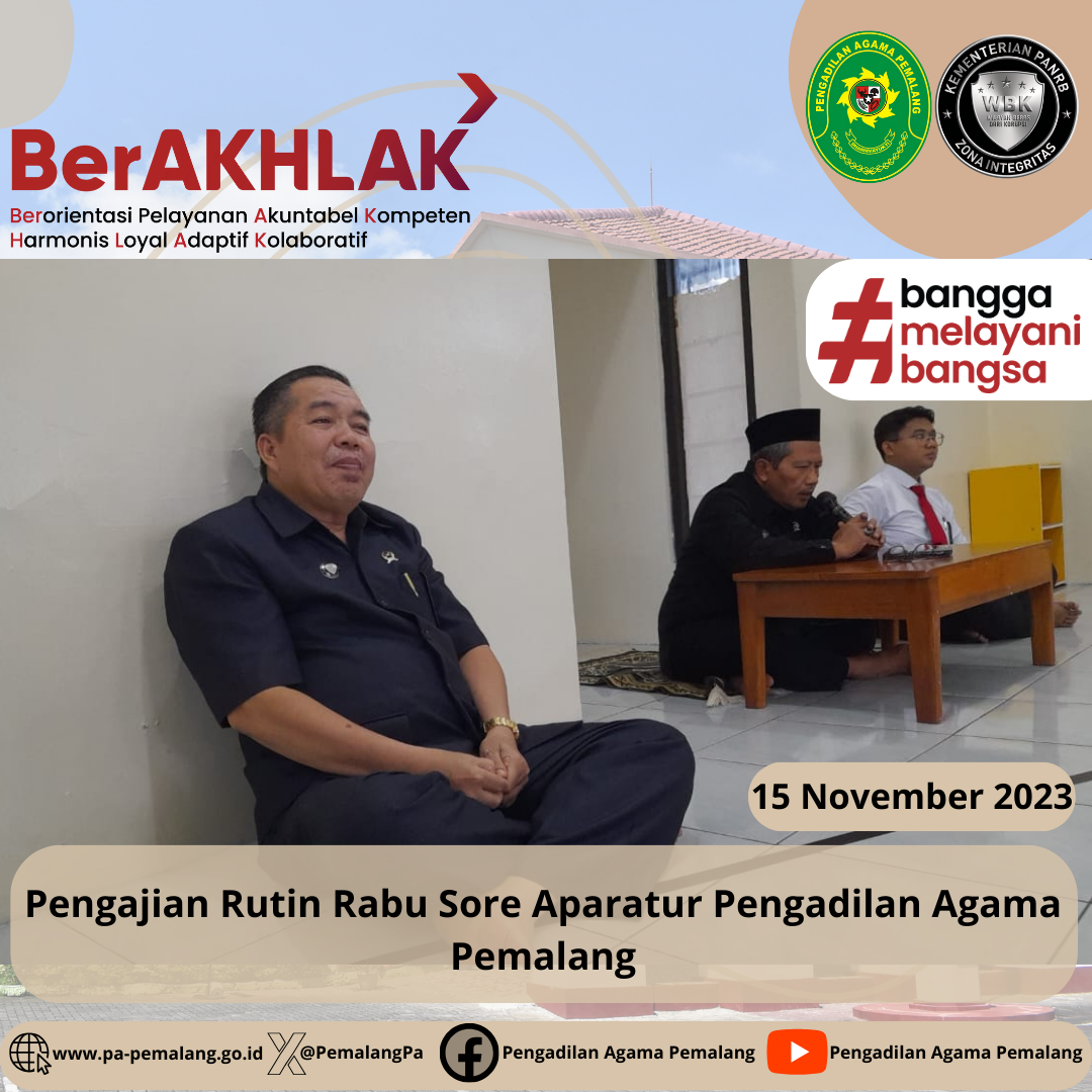Pengajian Rutin Rabu Sore Aparatur Pengadilan Agama Pemalang. Bertindak sebagai Pembicara Lukman Abdullah, S.H., M.H. Hakim Pengadilan Agama Pemalang. Tema Pengajian kali ini adalah mengenai Persaudaraan.