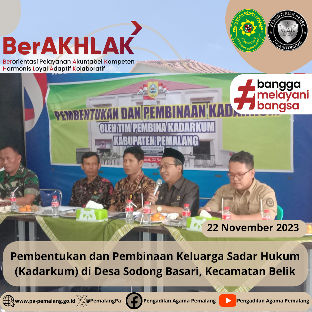 Mewakili Ketua Pengadilan Agama Pemalang, Wakil Ketua Pengadilan Agama Pemalang Drs. Husaini, S.H., M.H. menghadiri acara Keluarga Sadar Hukum (Kadarkum) di Desa Sodong Badari, Kec. Belik yang difasilitasi oleh pemerintah kabupaten Pemalang.(EYK)