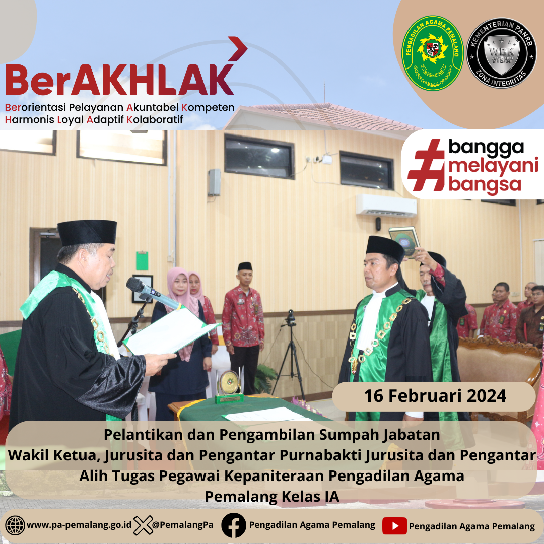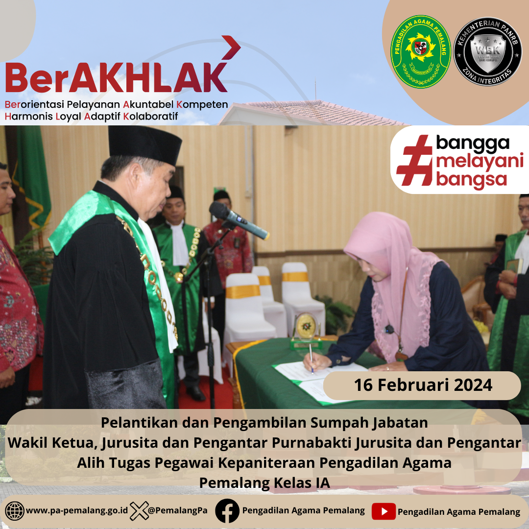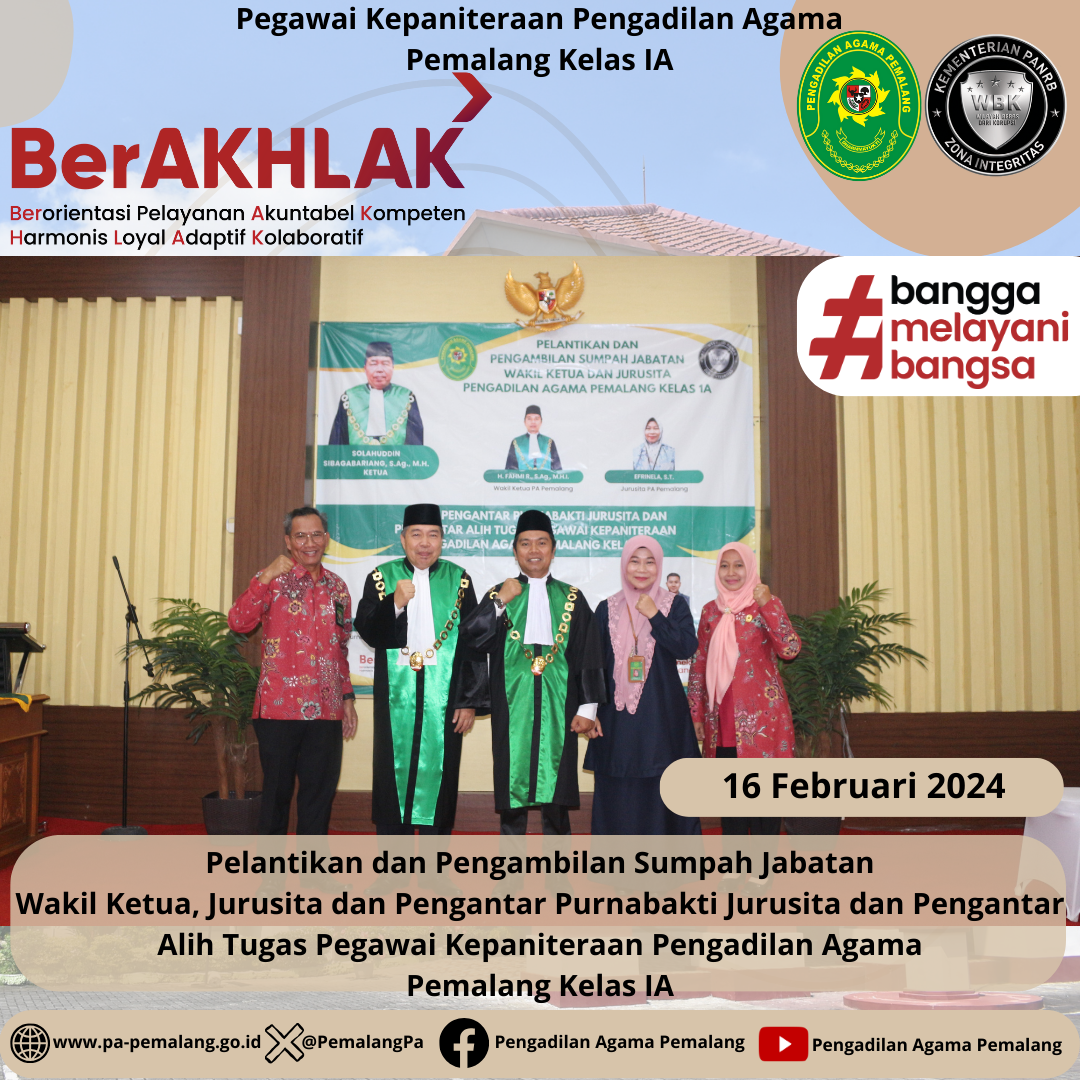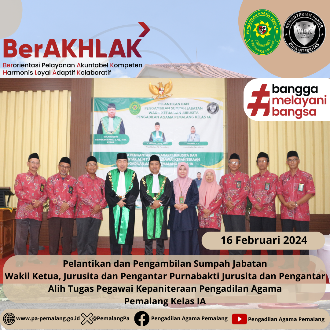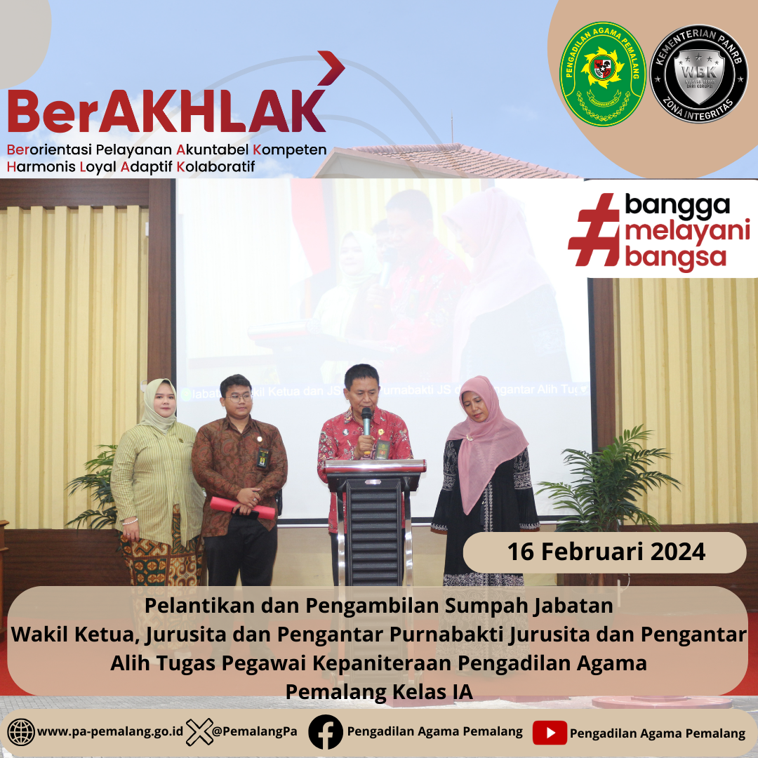 Bertempat di Ruang Sidang Utama Abu Bakar Ash Shidiq pukul 14.00 di laksanakan Pelantikan dan Pengambilan Sumpah Jabatan Wakil Ketua dan Jurusita Pengadilan Agama Pemalang H. FAHMI R., S.Ag. , M.H.I. sebagai Wakil Ketua dan EFRINELA, S.T. sebagai Jurusita serta Pengantar Purnabakti Jurusita Pengadilan Agama Pemalang H. Edy Fauzan dan Pengantar Alih Tugas Pegawai Kepaniteraan YUDHISTIRA ARY PRABOWO, S.H. (Magang Cakim di PN Pemalang) & SITI NURCHASANAH, S.H.(Magang Cakim di PA Purwokerto)