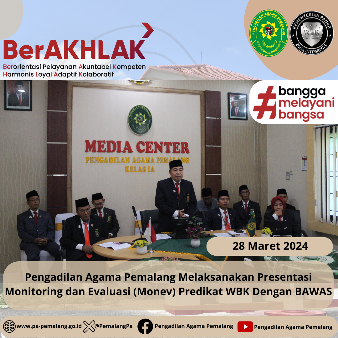 Kamis 28 Maret, Pengadilan Agama Pemalang melaksanakan presentasi monitoring dan evaluasi zona integritas dengan predikat WBK dihadapan Bawas. Ketua, Wakil Ketua, Panitera, Sekretaris dan seluruh Koordinator Area hadir bersama- sama di Media Center Pengadilan Agama Pemalang untuk mempresentasikan kondisi Pengadilan Agama Pemalang pasca memperoleh predikat WBK. Presentasi ini dimulai pukul 09.45 WIB dan berakhir pada 10.45 WIB, Ketua Pengadilan Agama Pemalang Solahuddin Sibagabariang, S.Ag.,M.H, mempresentasikan kondisi, inovasi dan alasan Pengadilan Agama Pemalang masih layak menyandang predikat WBK tersebut.