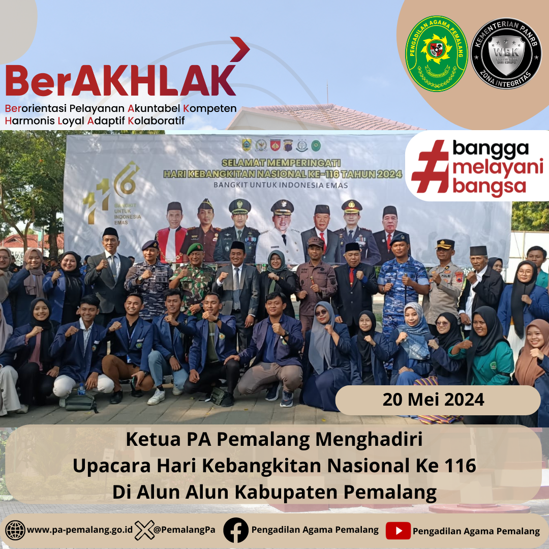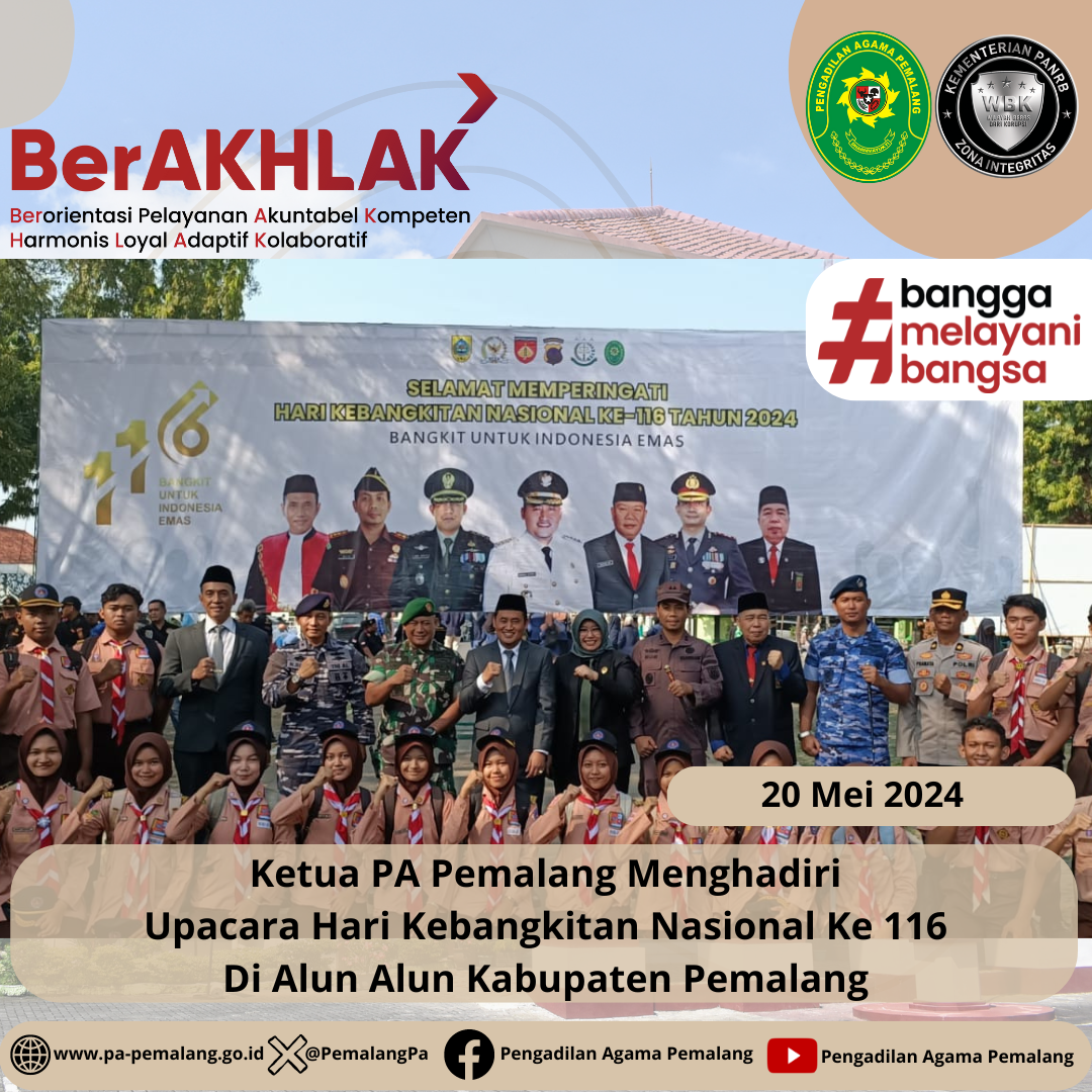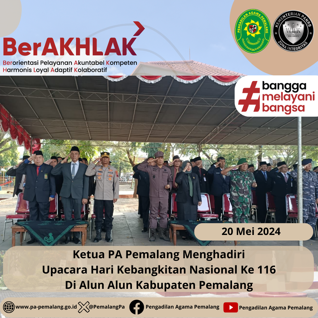 Dalam rangka memperingati Upacara Peringatan Hari Kebangkitan Nasional Ke-116 Tahun 2024, Ketua PA Pemalang Solahuddin Sibagabariang, S.Ag.,M.H. mengikuti kegiatan Upacara Peringatan Hari Kebangkitan Nasional Ke – 116 Tahun 2024, bertempat di Alun-alun Kabupaten Pemalang. Senin, (20/05/2024).