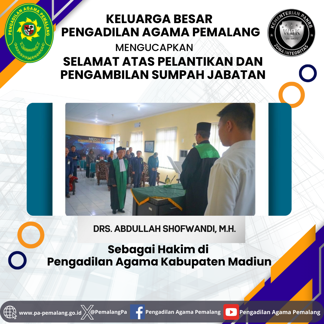 Keluarga Besar Pengadilan Agama Pemalang Mengucapkan Selamat Atas Pelantikan dan Sumpah Jabatan Drs. Abdullah Shofwandi, M.H. Sebagai Hakim di Pengadilan Agama Kabupaten Madiun.