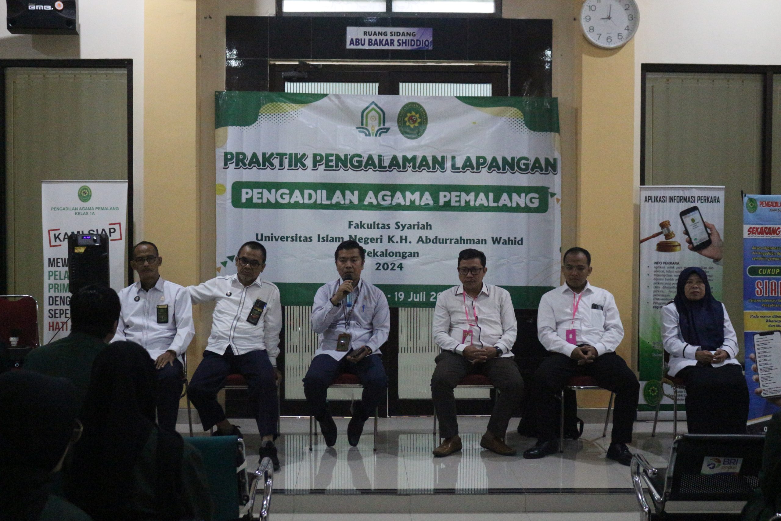 Sebanyak 36 orang mahasiswa UIN K.H Abdurrahman Wahid Pekalongan masing masing dari Prodi Hukum Keluarga Islam (HKI), Hukum Ekonomi Syariah (HES) dan Hukum Tata Negara (HTN) yang nantin nya akan terbagi menjadi 2 gelombang yang melaksanakan PPL di Pengadilan Agama Pemalang.