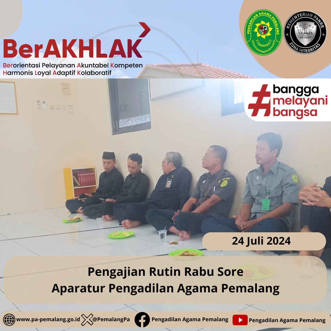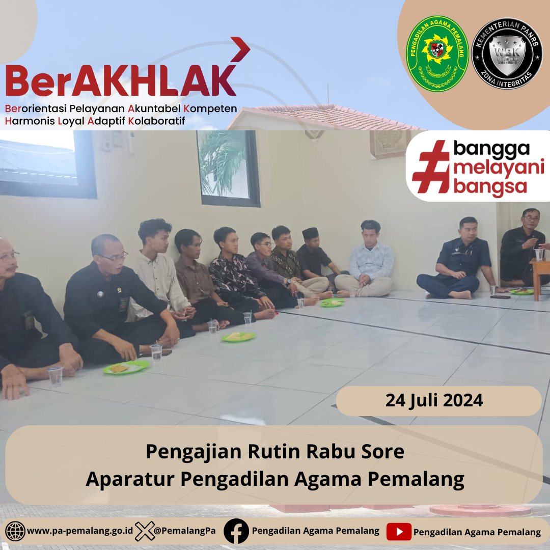 Pengajian Rutin Rabu Sore tanggal 10 Juli 2024 yang di adakan di Mushola Al Mahkamah setelah sholat Ashar berjamaah pada kali ini bertindak sebagai Pengisi Kajian adalah Hakim Pengadilan Agama Pemalang Drs. H. Mohammad Taufik, S.H.,M.S.I. Kali ini tema kajian nya adalah mengenai pentingnya aqidah, akhlakul karimah dengan sesama dan syariah syariah dalam beribadah sebagai pegangan kita dalam berkehidupan