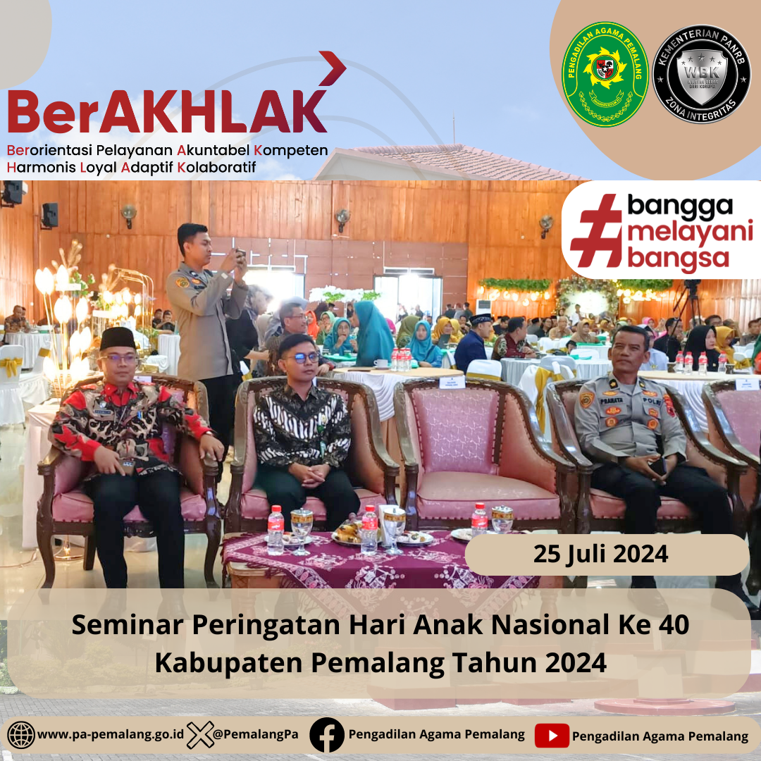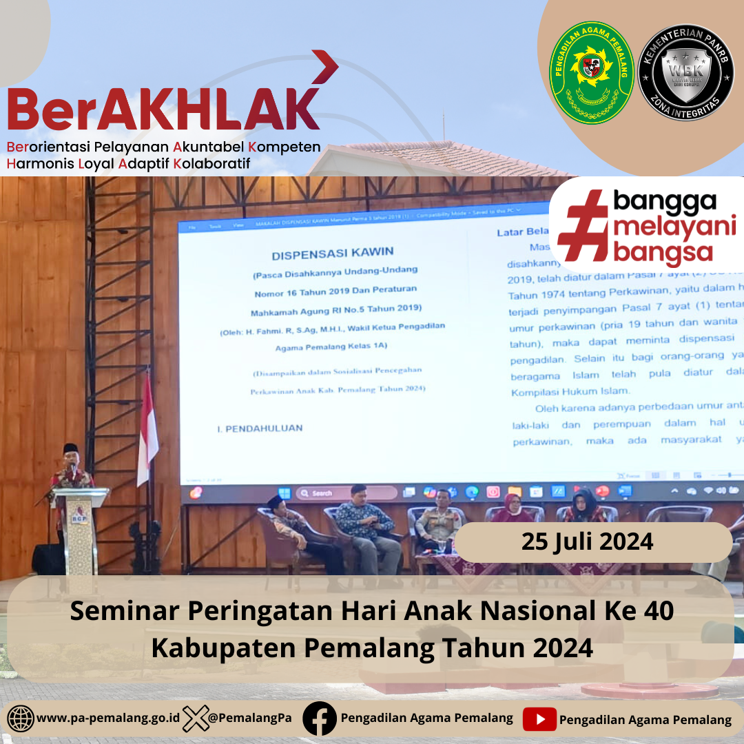 Wakil Ketua Pengadilan Agama Pemalang H. Fahmi, R,S.Ag.,M.H.I menghadiri Undangan sebagai Narasumber dalam Acara Seminar Peringatan Hari Anak Nasional Ke 40 Kabupaten Pemalang Tahun 2024 dengan Tema “Anak Merdeka dari Kekerasan, Perkawinan Anak, Pekerja Anak dan Stunting” di Gedung RGP Convention Center Pemalang. Dalam Kesempatan tersebut beliau memberikan materi mengenai Dispensasi Kawin.