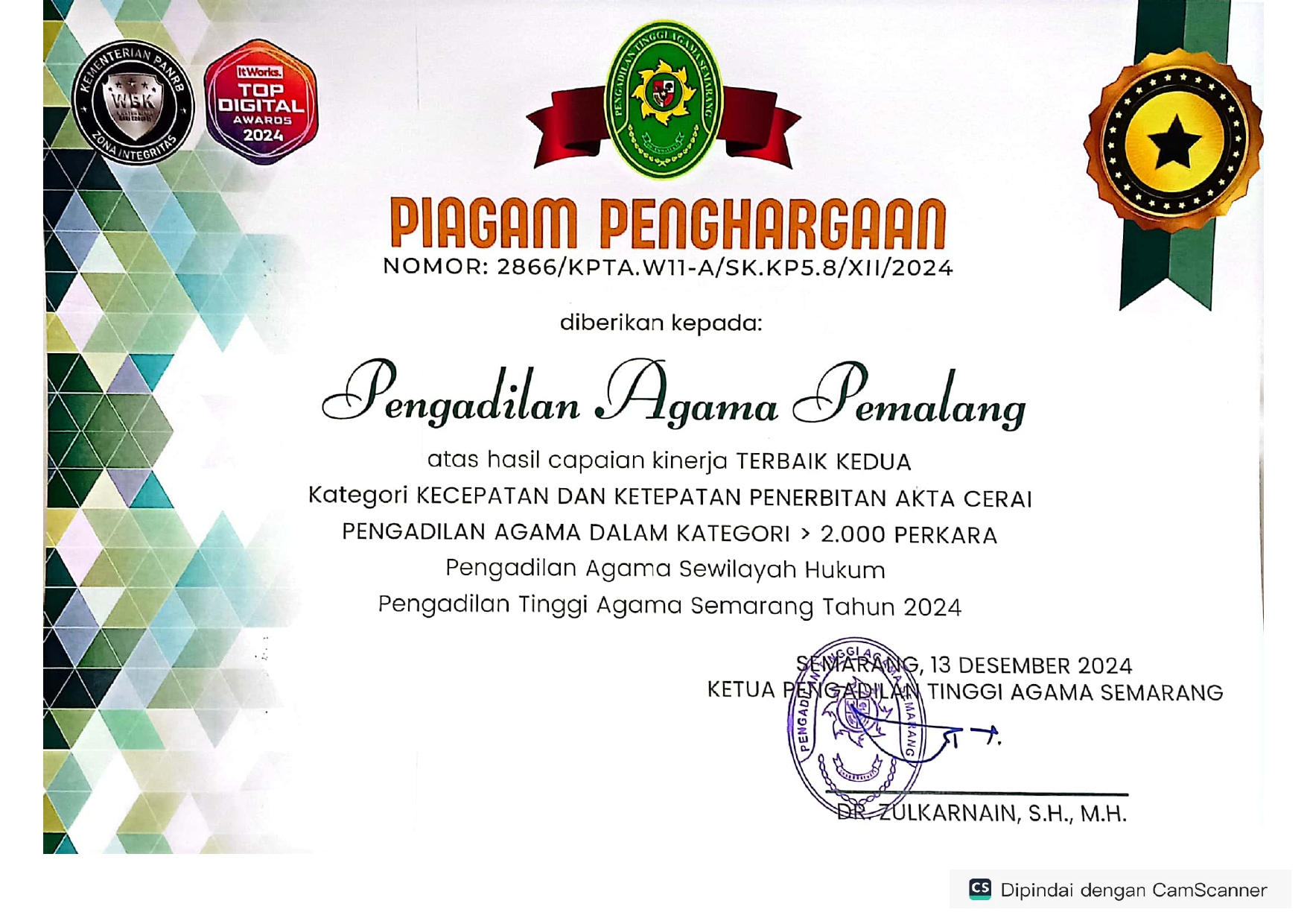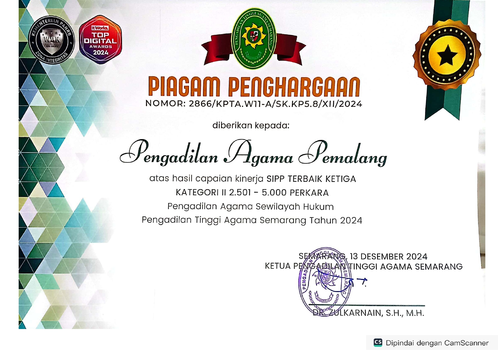 Acara kemudian dilanjutkan dengan pemberian penghargaan pada satuan kerja yang berprestasi. Pada kesempatan kali ini Pengadilan Agama Pemalang meraih beberapa Penghargaan Antara lain :