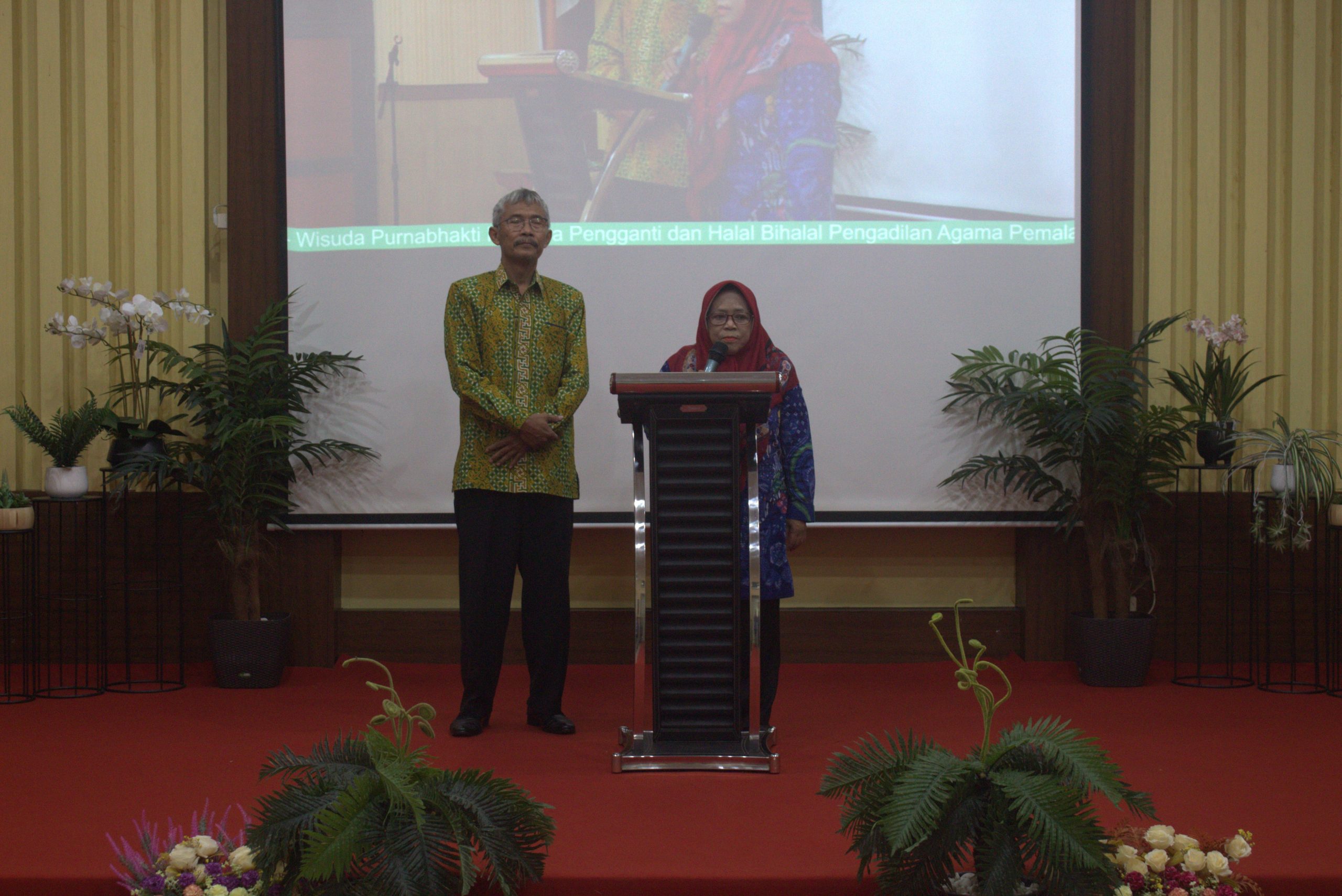 Acara di lanjutkan dengan pembacaan surat keputusan dari Sekretaris MARI kemudian menyanyikan lagu Indonesia Raya dan Himne MA RI. Proses Wisuda di Pimpin langsung oleh Ketua Pengadilan Agama Pemalang dengan melepaskan lencana Kepaniteraan dan pemberian bunga. Acara di lanjutkan dengan foto Bersama sambutan sambutan dan doa Bersama dan penyerahan cinderamata sebagai penutup acara. Kemudian acara berlanjut dengan Halal Bi Halal Keluarga Besar Pengadilan Agama Pemalang. (EYK)