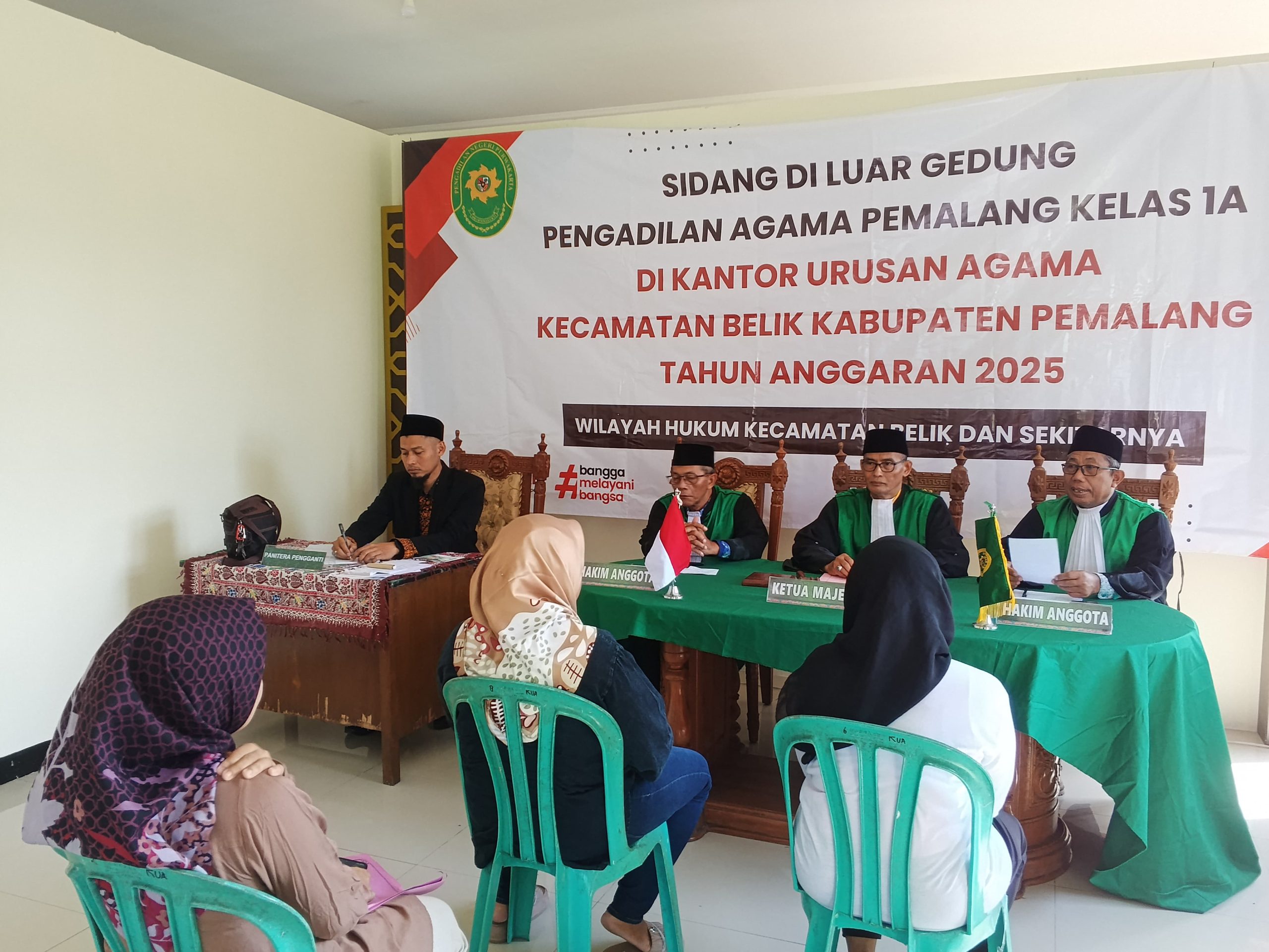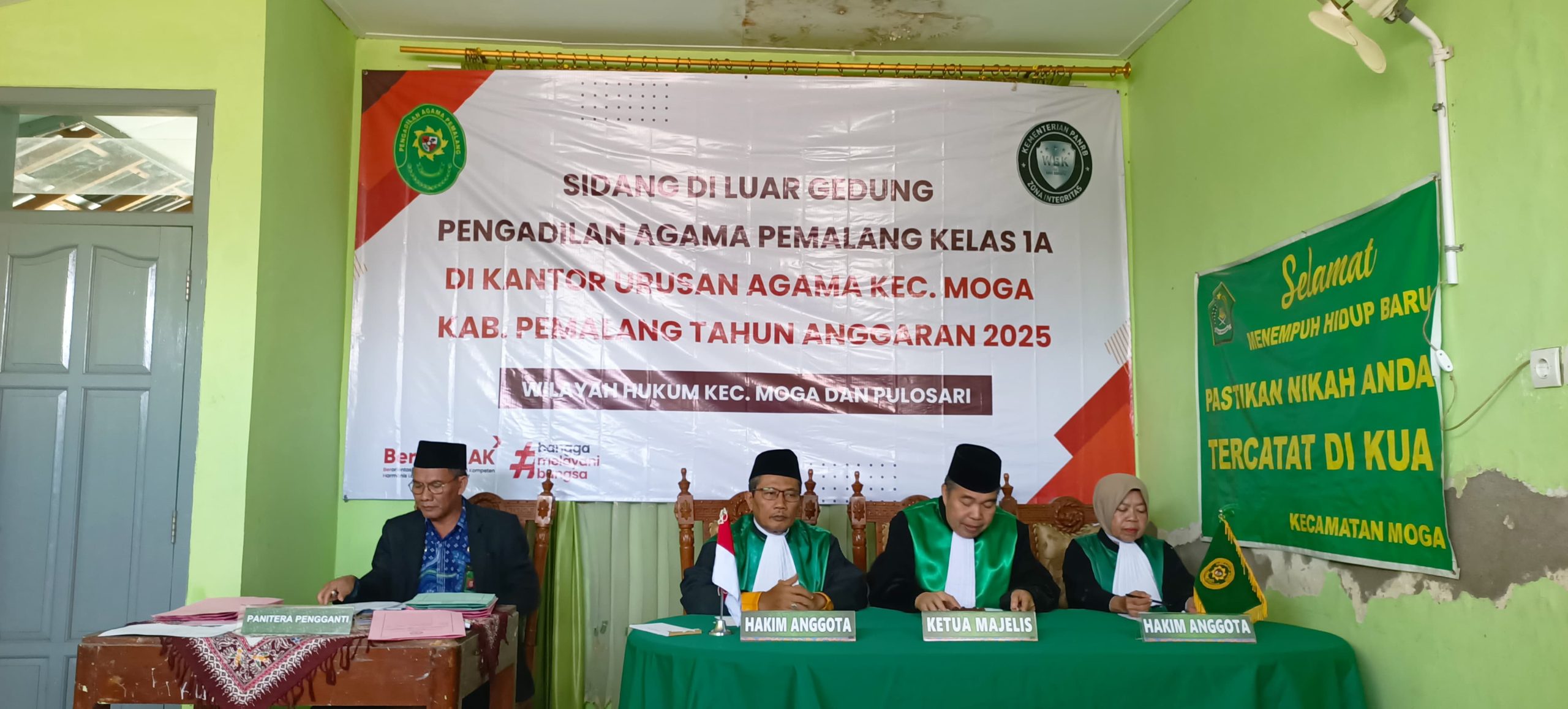 Pelaksanaan Sidang di Luar Gedung ( Sidang Keliling ) Pengadilan Agama Pemalang di KUA Kecamatan Belik Dan KUA Kecamatan Moga Kabupaten Pemalang. Sidang keliling Di KUA Belik Kecamatan Belik Kabupaten Pemalang hari ini terdiri dari Ketua Majelis Drs. H. Sobirin, M.H, didampingi 2 Hakim Anggota yaitu Drs. M. Sakdulloh dan Drs. Mohamad Taufik, S.H., M.S.I. dan Panitera Pengganti Adam Adzkiya Afifi, S.H.. Sementara di KUA Moga terdiri dari Ketua Majelis H. Solahuddin Sibagabariang, S.Ag.,M.H didampingi 2 hakim anggota yaitu Lukman Abdullah, S.H., M.H. dan Muwafiqoh,S.H.,M.H dan Panitera Muhammad Salafudin, S.Ag.,M.H. Dengan dilaksanakannya kegiatan sidang keliling ini mampu membantu masyarakat yang tempat tinggalnya jauh dari pengadilan dan ingin berperkara di Pengadilan Agama Pemalang, sehingga bisa mewujudkan pelayanan prima.