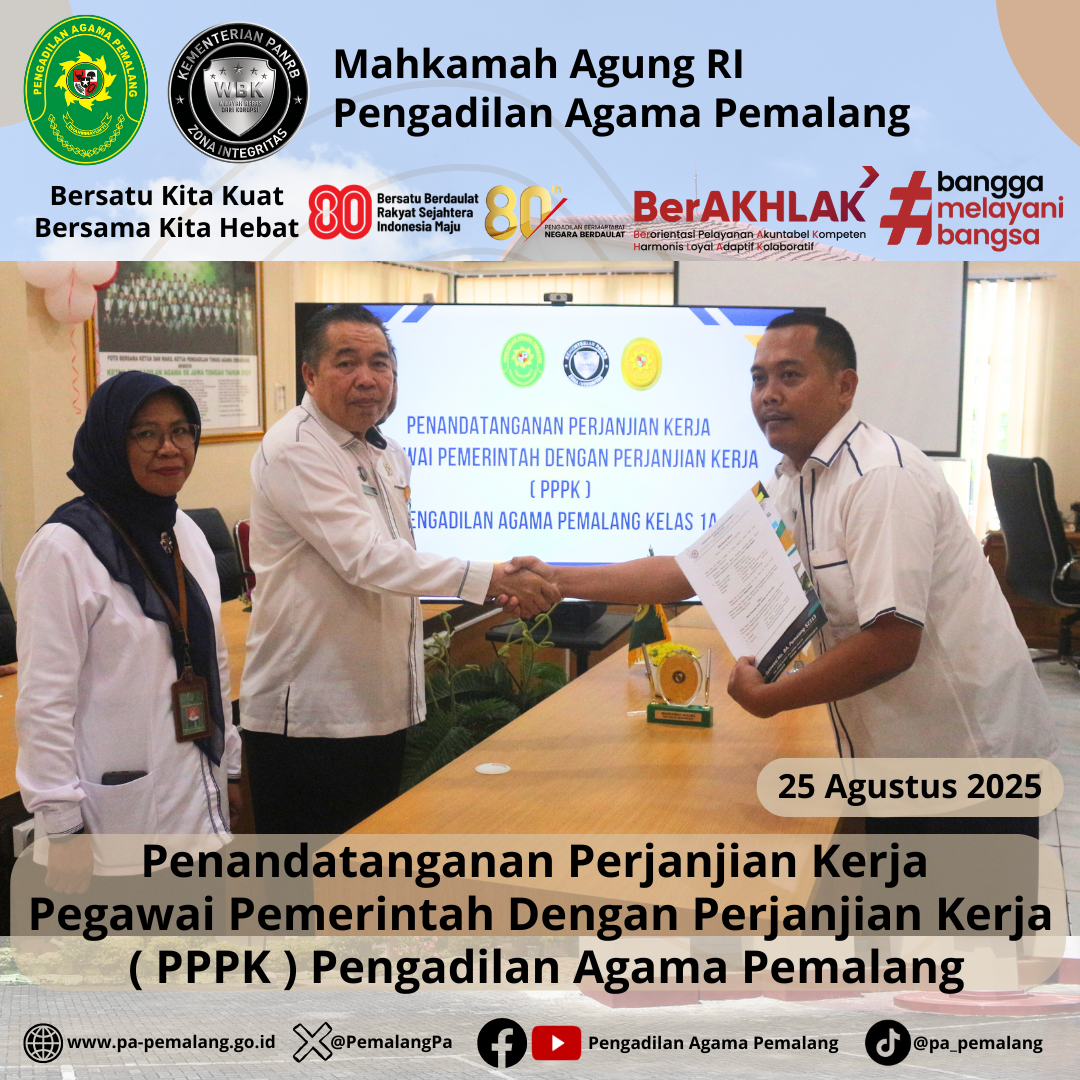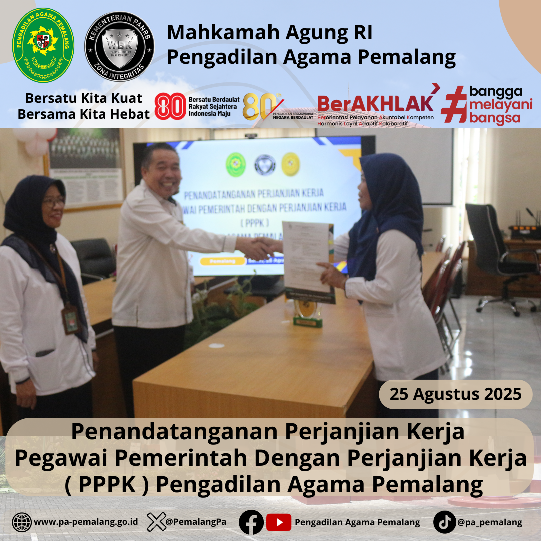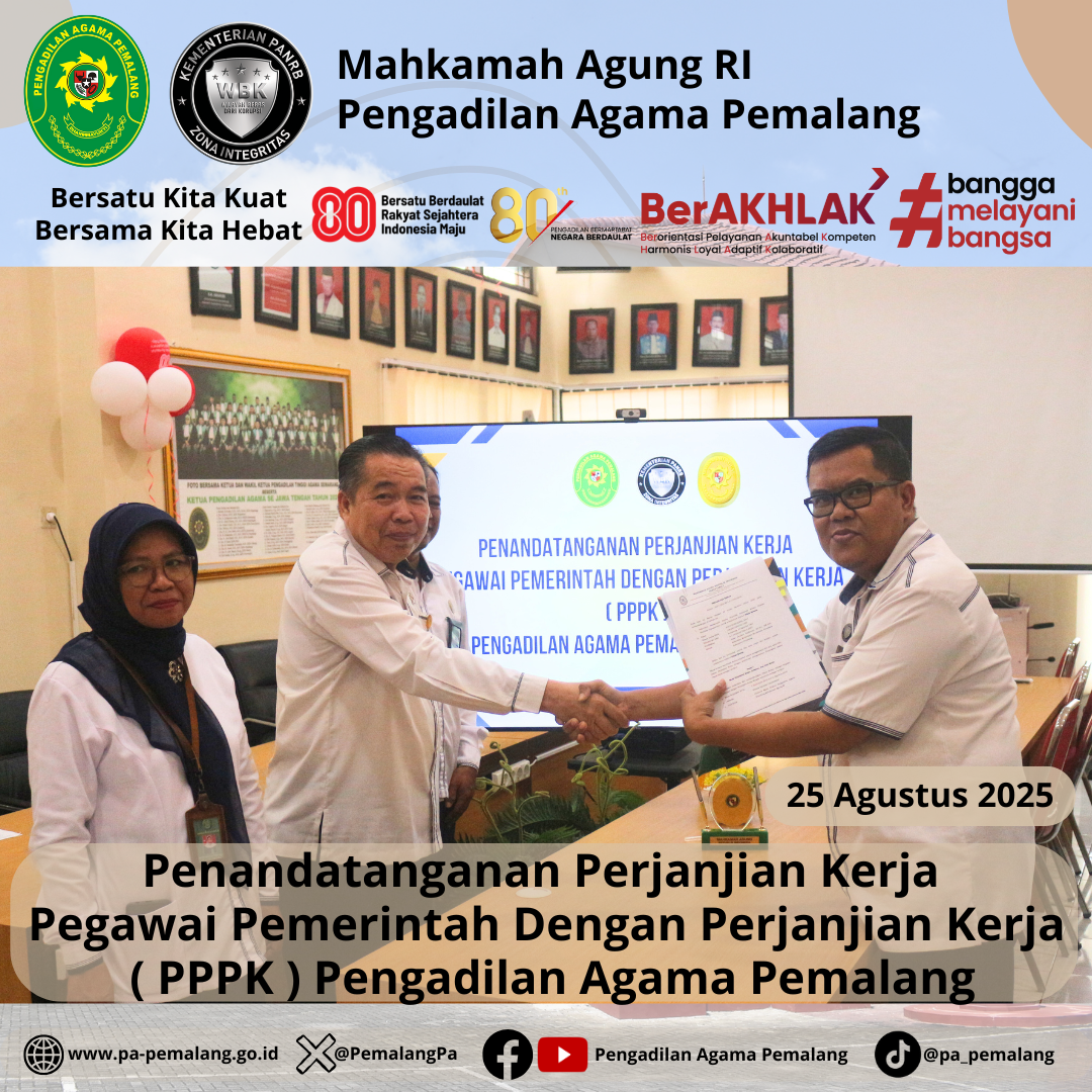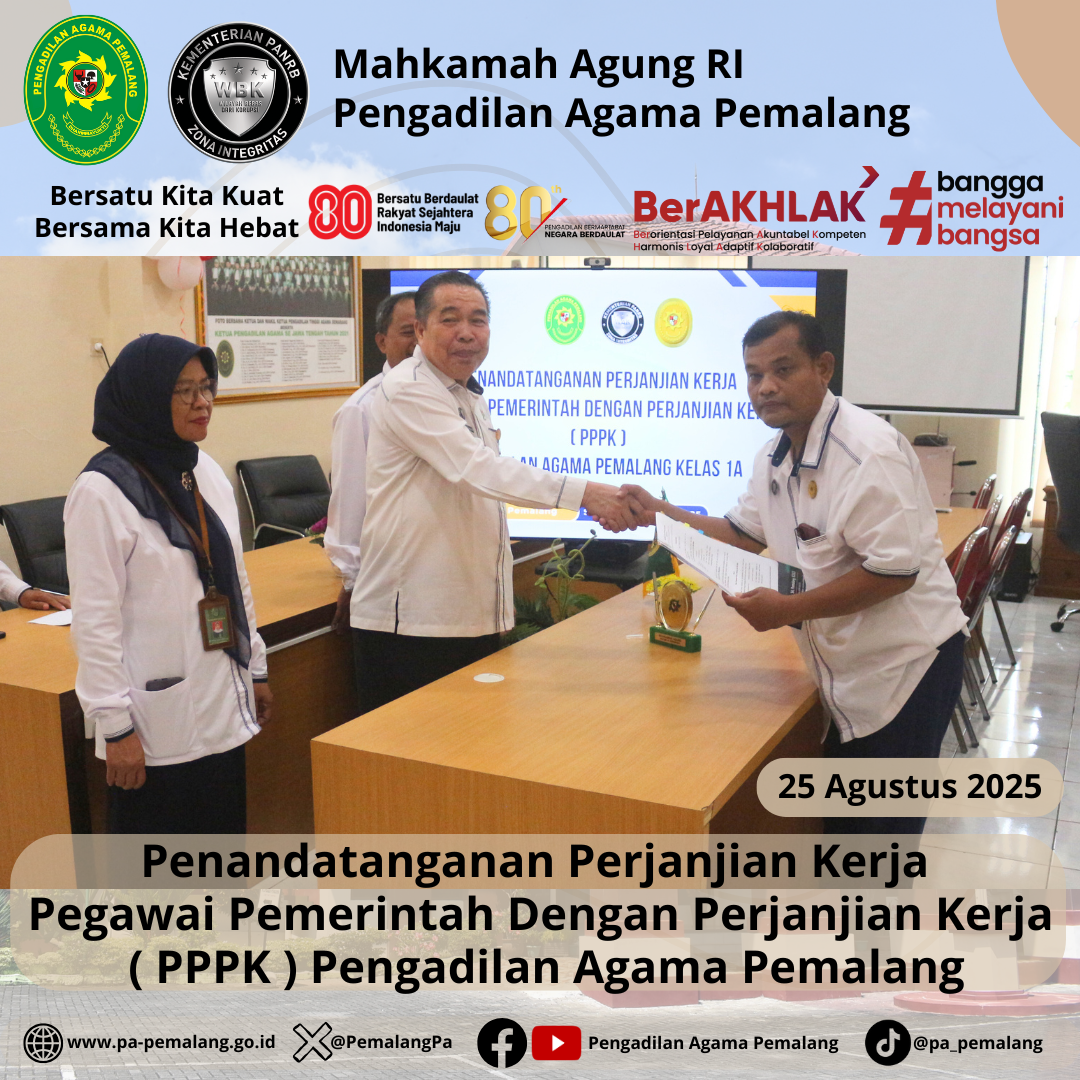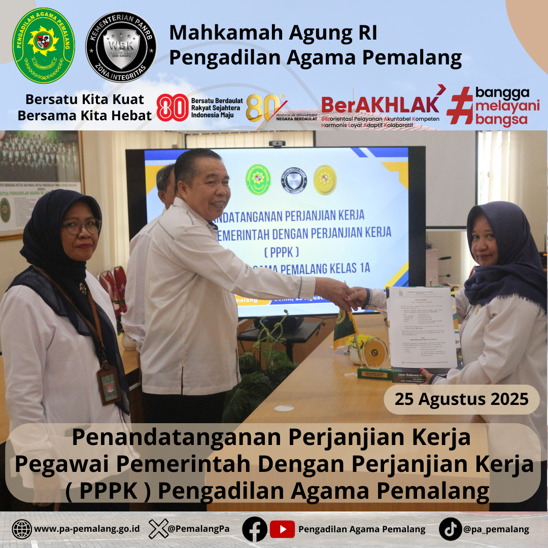 Bertempat di Media Center Pengadilan Agama Pemalang, dilaksanakan Penandatanganan Perjanjian Kerja Pegawai Pemerintah Dengan Perjanjian Kerja ( PPPK ) Pengadilan Agama Pemalang. Acara di Pimpin langsung oleh Ketua Pengadilan Agama Pemalang, H. Solahuddin Sibagabariang, S.Ag., M.H didampingi oleh Panitera dan Sektetaris Pengadilan Agama Pemalang.