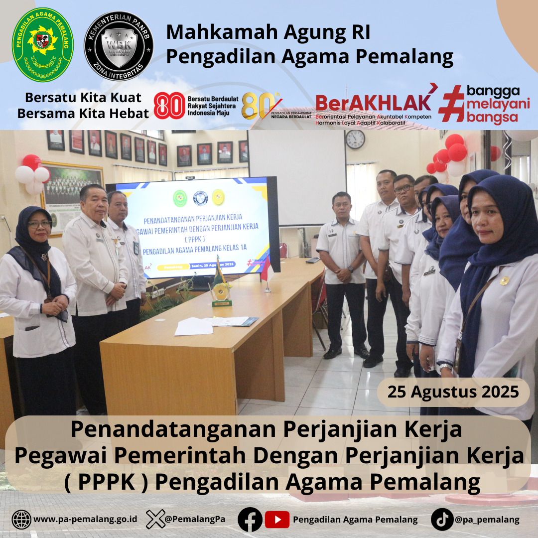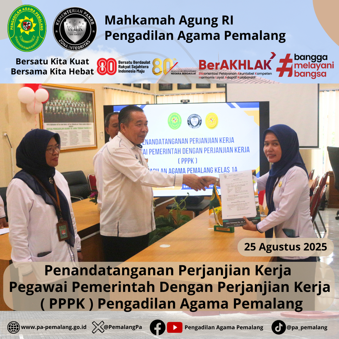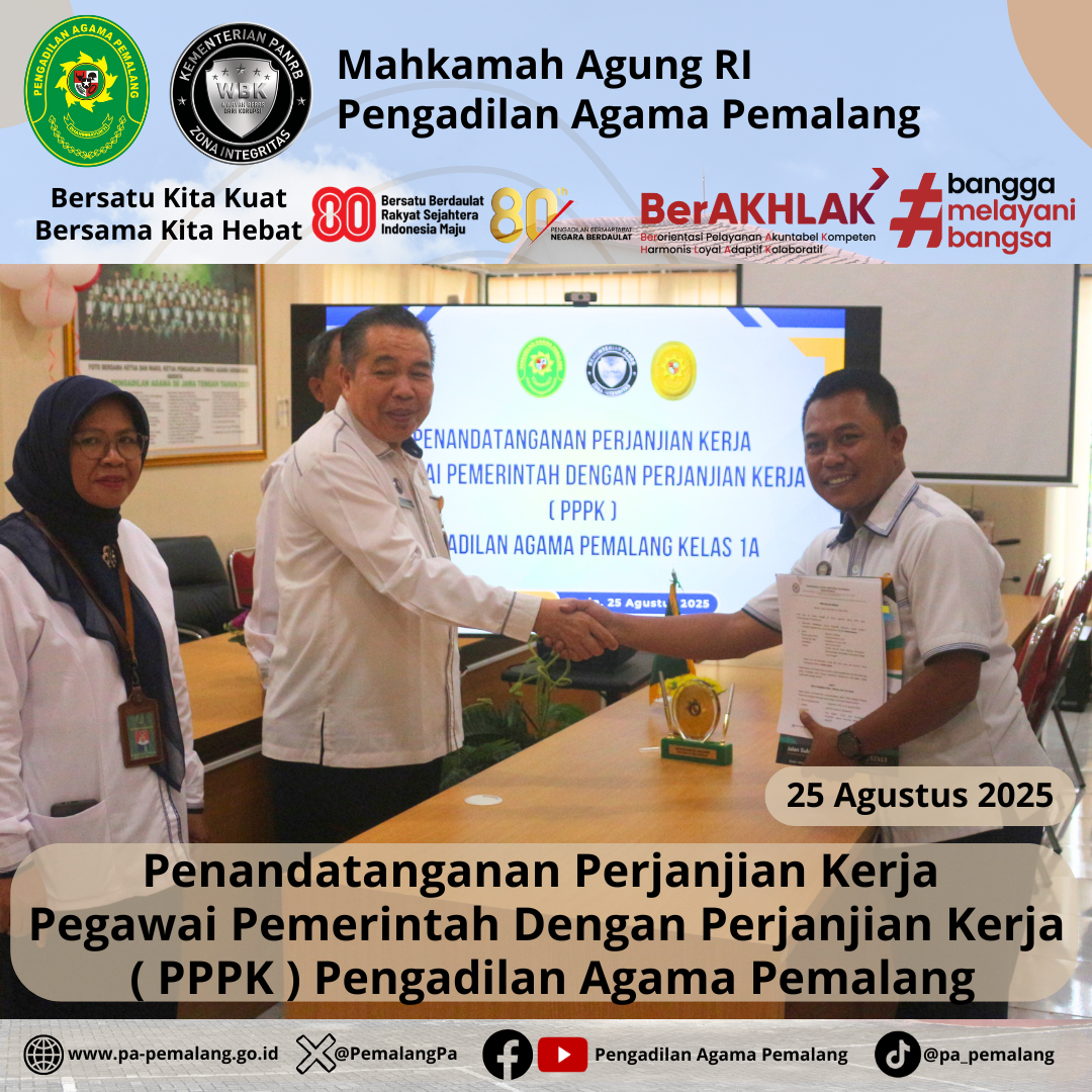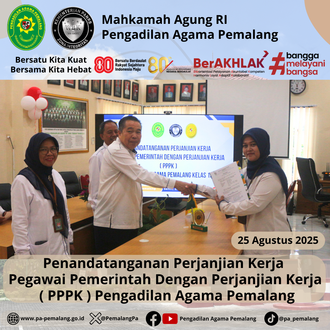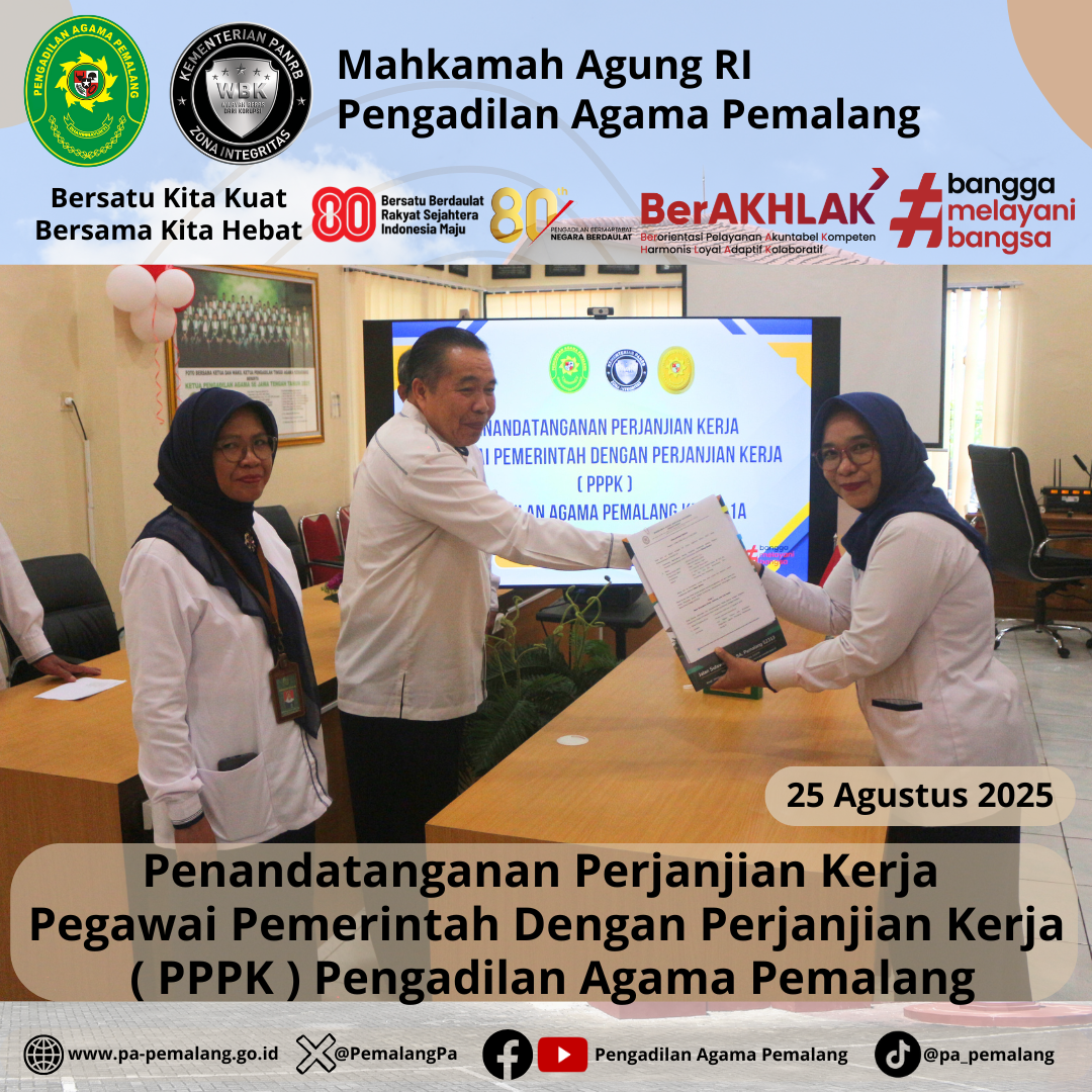 Bertempat di Media Center Pengadilan Agama Pemalang, dilaksanakan Penandatanganan Perjanjian Kerja Pegawai Pemerintah Dengan Perjanjian Kerja ( PPPK ) Pengadilan Agama Pemalang. Acara di Pimpin langsung oleh Ketua Pengadilan Agama Pemalang, H. Solahuddin Sibagabariang, S.Ag., M.H didampingi oleh Panitera dan Sektetaris Pengadilan Agama Pemalang.