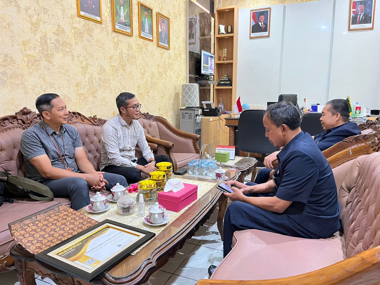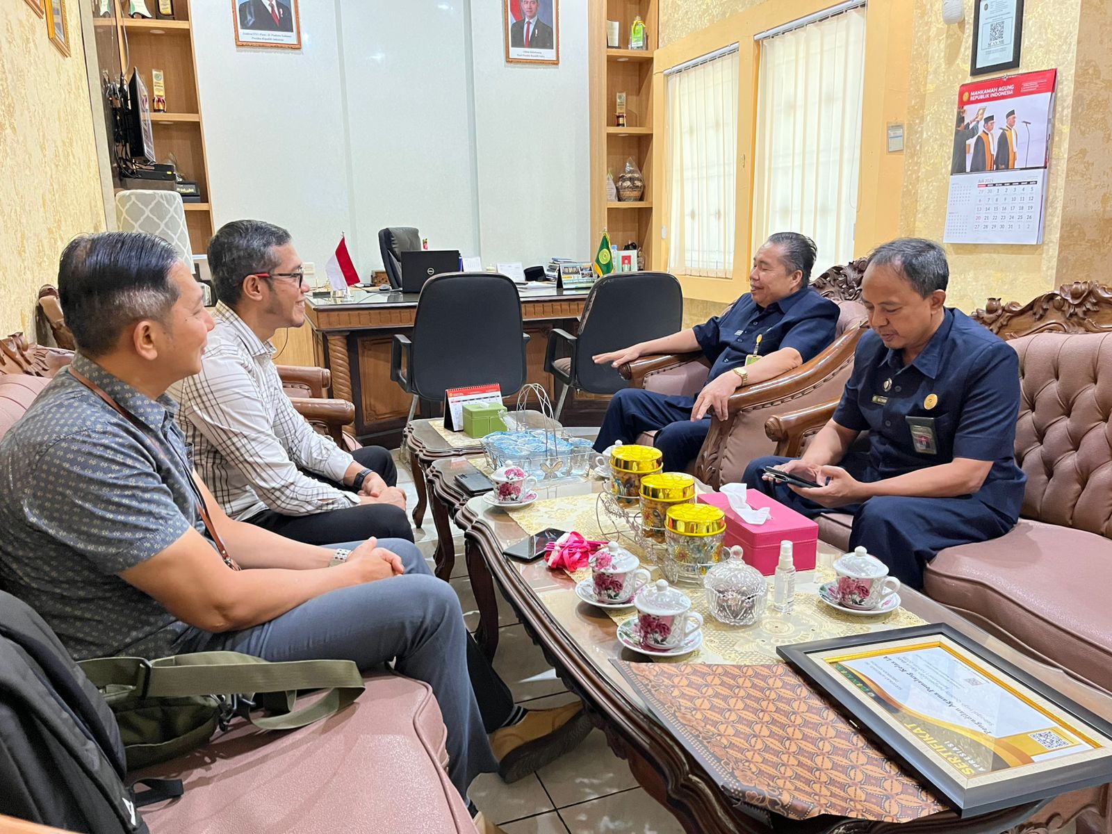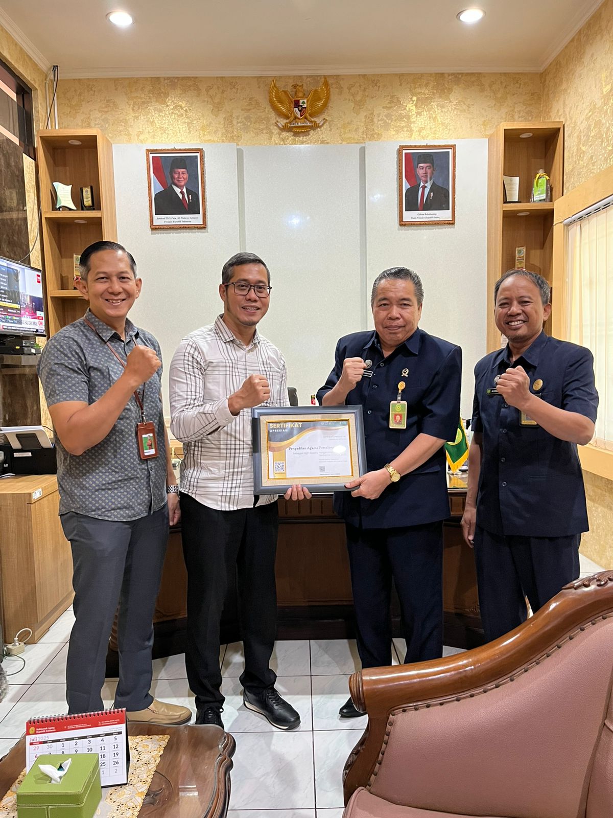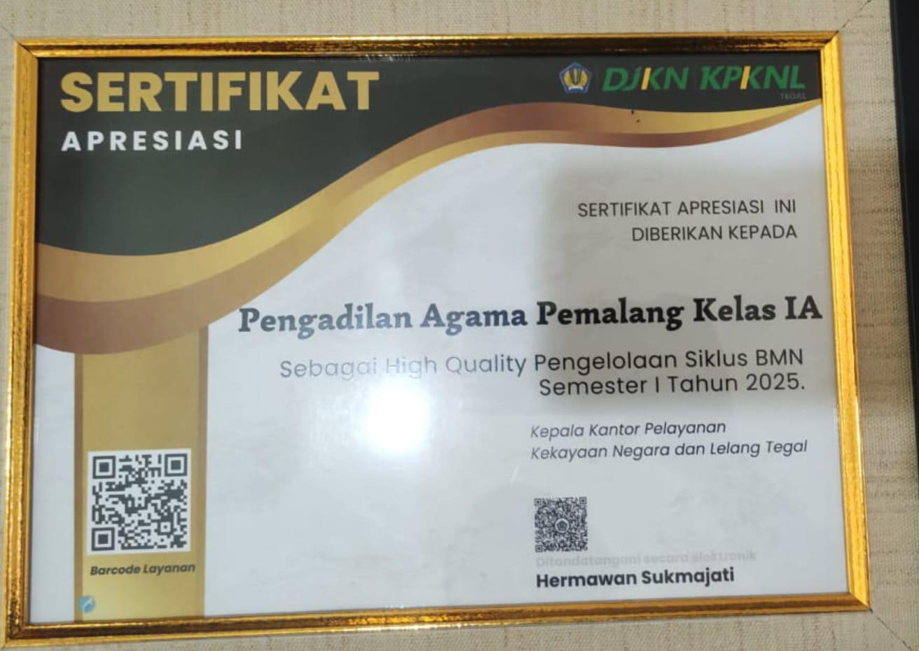 Bertempat di Ruang Ketua Pengadilan Agama Pemalang, Dilaksanakan Penyerahan Penghargaan dari KPKNL Sebagai High Quality Pengelolaan Siklus BMN Semester I Tahun 2025. Hadir Ketua KPKNL Bapak Hermawan Sukmajati dan Kepala Seksi Pengelolaan BMN Bpk Septsono.