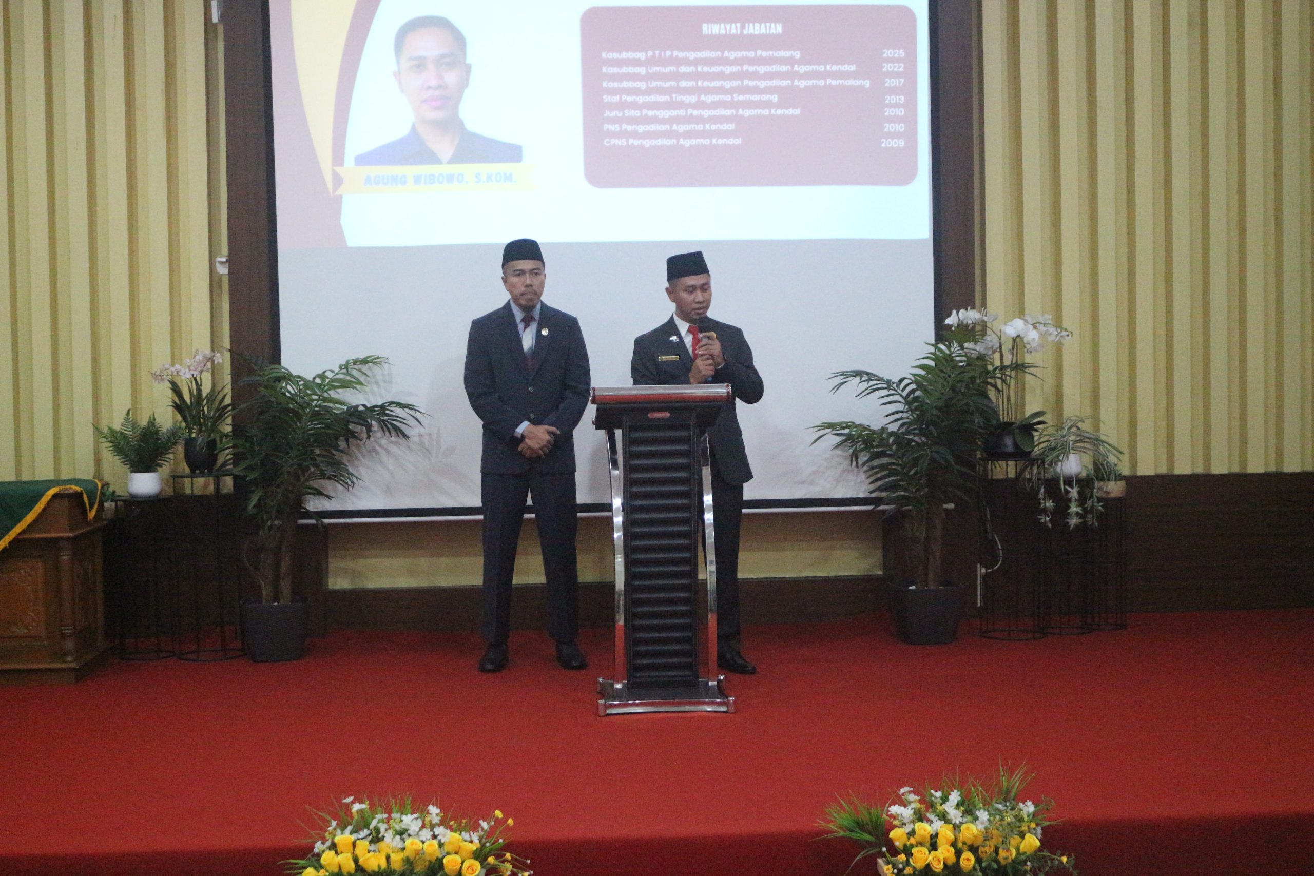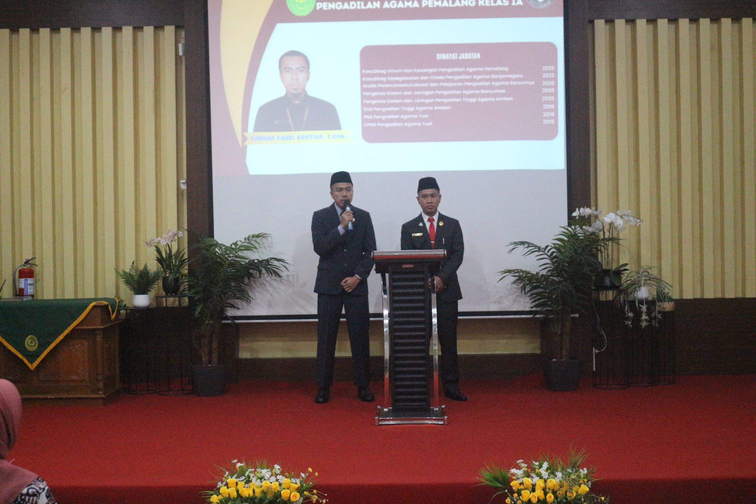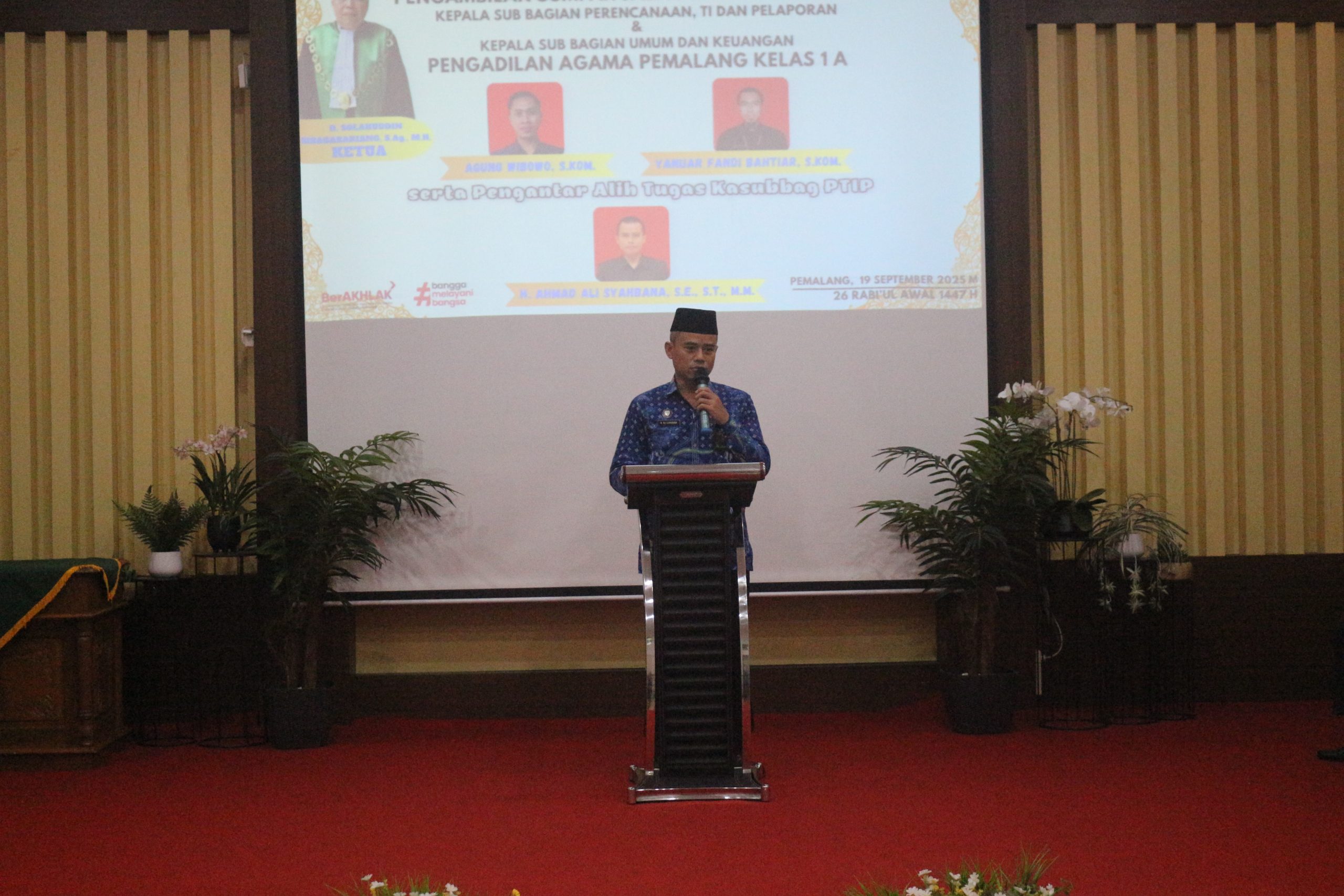 Bertempat di Ruang Sidang Utama Abu Bakar Ash Shidiq pukul 09.00 WIB di laksanakan Pengambilan Sumpah Jabatan Dan Pelantikan Kepala Sub Bagian Perencanaan, TI & Pelaporan Agung Wibowo, S.Kom Dan Kepala Sub Bagian Umum & Keuangan Yanuar Fandi Bahtiar, S.Kom Serta Pengantar Alih Tugas Kepala Sub Bagian Perencanaan, TI & Pelaporan H. Ahmad Ali Syahbana, S.E.,S.T.,M.M yang pindah tugas ke Pengadilan Agama Kendal. Acara Di buka dengan Menyanyikan lagu Indonesia Raya dan Himne Mahkamah Agung dilanjutkan dengan doa Bersama yang di Pimpin oleh Hakim Pengadilan Agama Pemalang Drs. Muhd Jazuli. Selepas Doa Bersama acara dilanjutkan PPengambilan Sumpah Jabatan Dan Pelantikan Kepala Sub Bagian Perencanaan, TI & Pelaporan Agung Wibowo, S.Kom Dan Kepala Sub Bagian Umum & Keuangan Yanuar Fandi Bahtiar, S.Kom dipimpin langsung oleh Ketua Pengadilan Agama Pemalang H. Solahuddin Sibagabariang, S.Ag.,M.H.