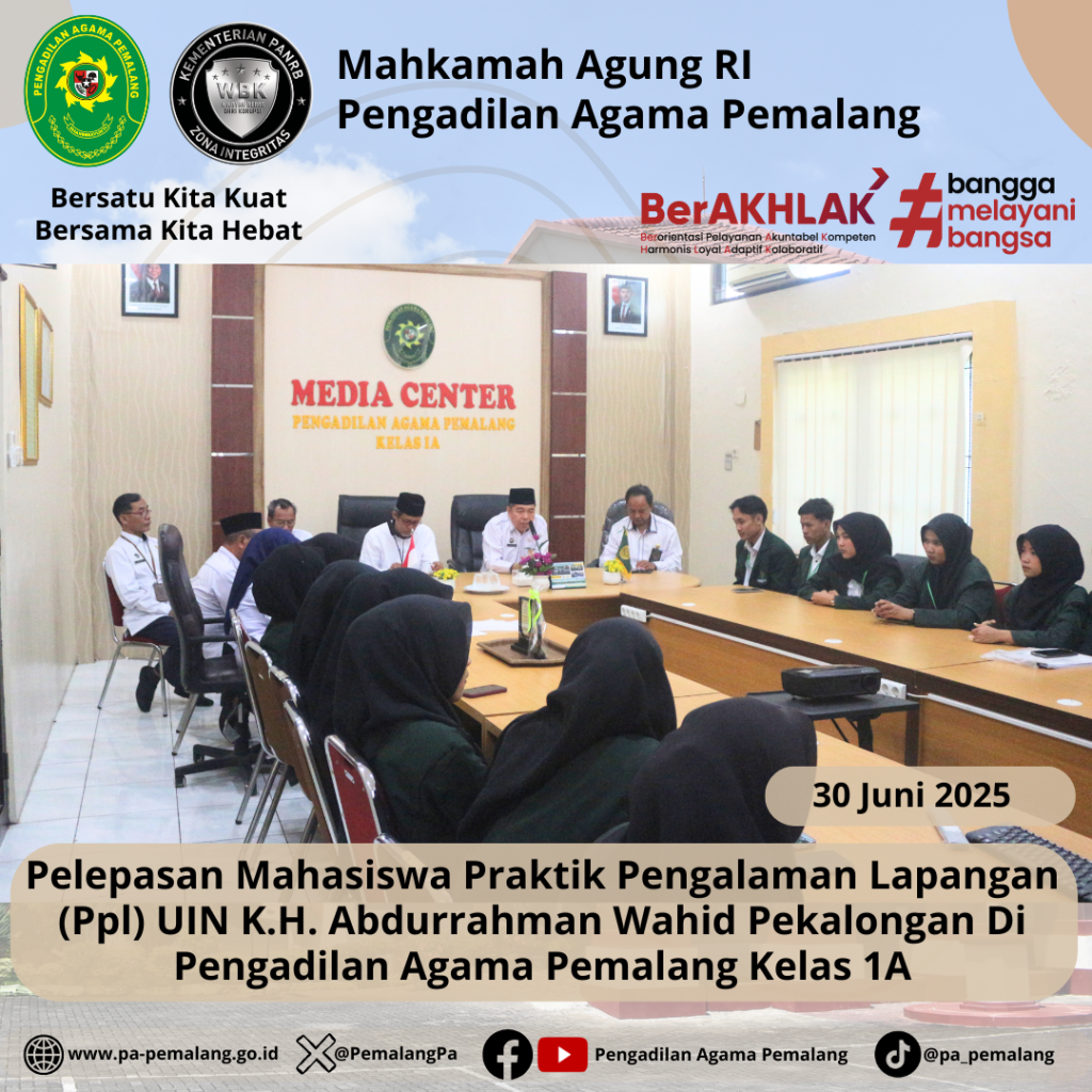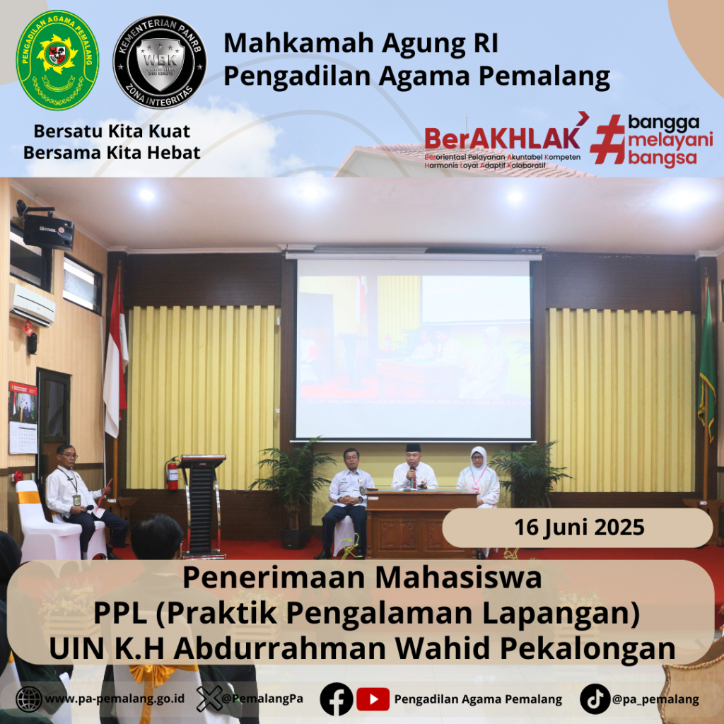 PENERIMAAN MAHASISWA PPL UIN K.H Abdurrahman Wahid Pekalongan DI PENGADILAN AGAMA PEMALANG Pemalang, 16 Juni 2025. Bertempat di Ruang Sidang Utama, Ketua Pengadilan Agama Pemalang H. Solahuddin Sibagabariang, S.Ag.,M.H. dengan Hakim Pembimbing PPL Drs. Syamsul Falah, M.H dan Muwafiqoh,S.H.,M.H menerima mahasiswa dari UIN K.H Abdurrahman Wahid Pekalongan untuk melaksanakan Praktik Pengalaman Lapangan (PPL) di Pengadilan […]