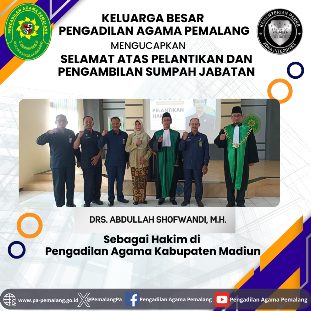 Keluarga Besar Pengadilan Agama Pemalang Mengucapkan Selamat Atas Pelantikan dan Sumpah Jabatan Drs. Abdullah Shofwandi, M.H. Sebagai Hakim di Pengadilan Agama Kabupaten Madiun.