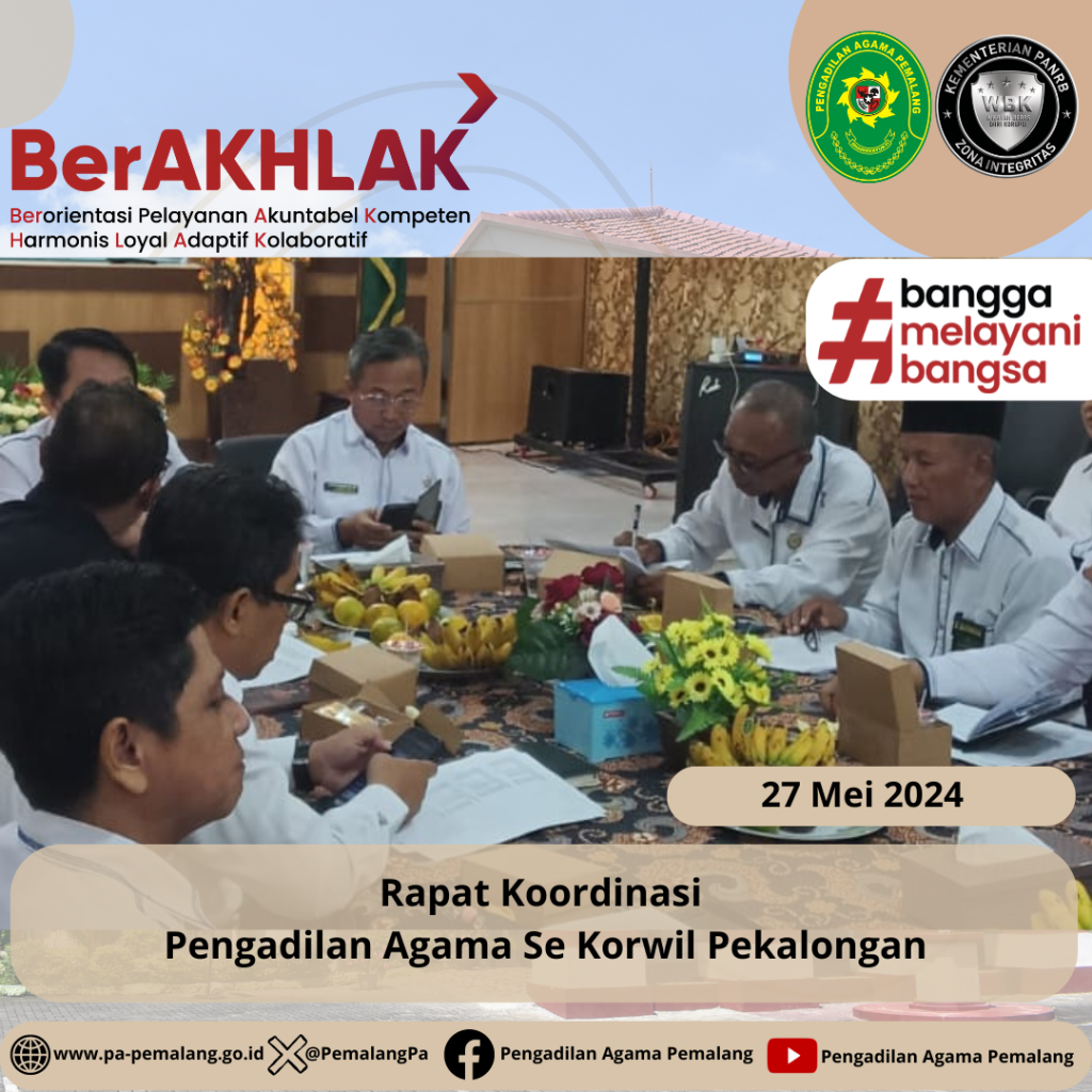 Rapat Koordinasi Pengadilan Agama Se Korwil Pekalongan Rapat Koordinasi Pengadilan Agama Se Korwil Pekalongan tanggal 27 mei 2024. Acara di buka oleh sambutan Ketua Pengadilan Agama Pekalaongan dilanjutkan dengan acara inti yang di pimpin oleh Ketua Korwil Pekalongan.