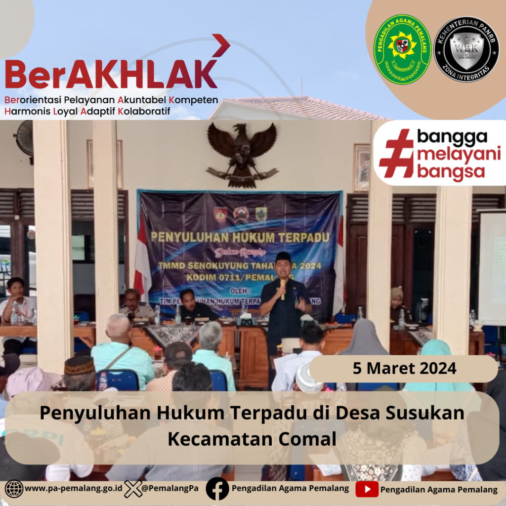 Penyuluhan Hukum Terpadu di Desa Susukan Kecamatan Comal Kabupaten Pemalang Selasa, 5 Maret 2024 Wakil Ketua Pengadilan Agama Pemalang H. Fahmi R., S.Ag.,M.H.I mengikuti kegiatan Penyuluhan Hukum Terpadu di Desa Susukan Kecamatan Comal, Kabupaten Pemalang. Dalam Kesempatan ini Beliau Memperkenalkan kepada Masyarakat tentang berperkara secara elektronik atau E Court, Gugatan sederhana dan Mediasi.