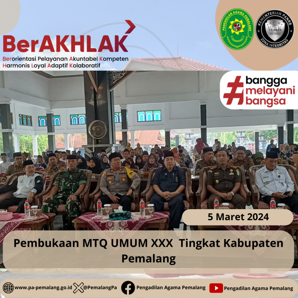 Pembukaan MTQ UMUM XXX Tingkat Kabupaten Pemalang Tahun 2024 di Pendopo Kabupaten Pemalang. Selasa, 5 Maret 2024 Ketua Pengadilan Agama Pemalang Solahuddin Sibagabariang, S.Ag., M.H menghadiri acara Pembukaan MTQ UMUM XXX Tingkat Kabupaten Pemalang Tahun 2024 di Pendopo Kabupaten Pemalang.