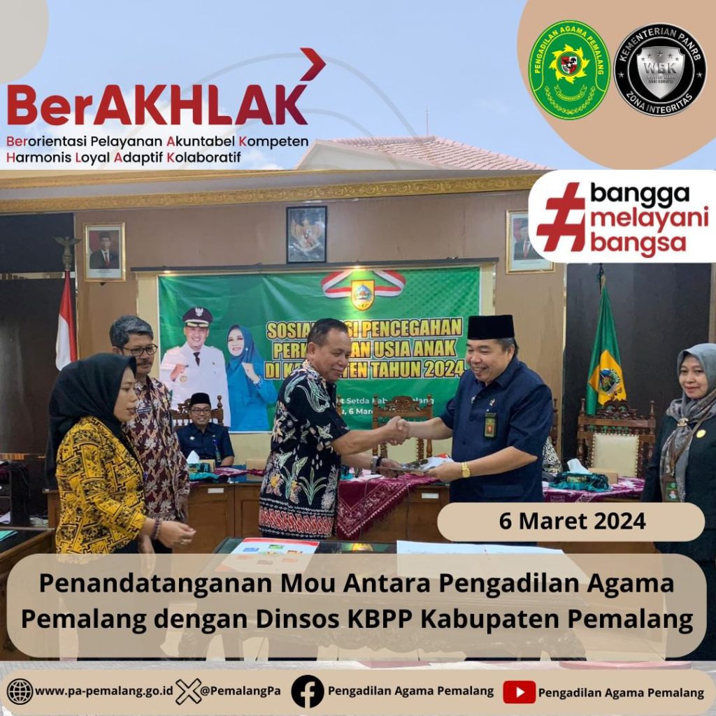 Penandatanganan Mou Antara Pengadilan Agama Pemalang dengan Dinsos KBPP Kabupaten Pemalang Pemalang 6 Maret 2024 Ketua Pengadilan Agama Pemalang Solahuddin Sibagabariang, S.Ag.,M.H dan Kepala Dinsos KBPP Menandatanganan Kesepakatan tentang layanan terpadu dispensasi kawin, Data Terpadu Kesejahteraan Sosial (DTKS) dalam perkara Prodeo dan pendampingan anak di Ruang Rapat Setda Kabupaten Pemalang.