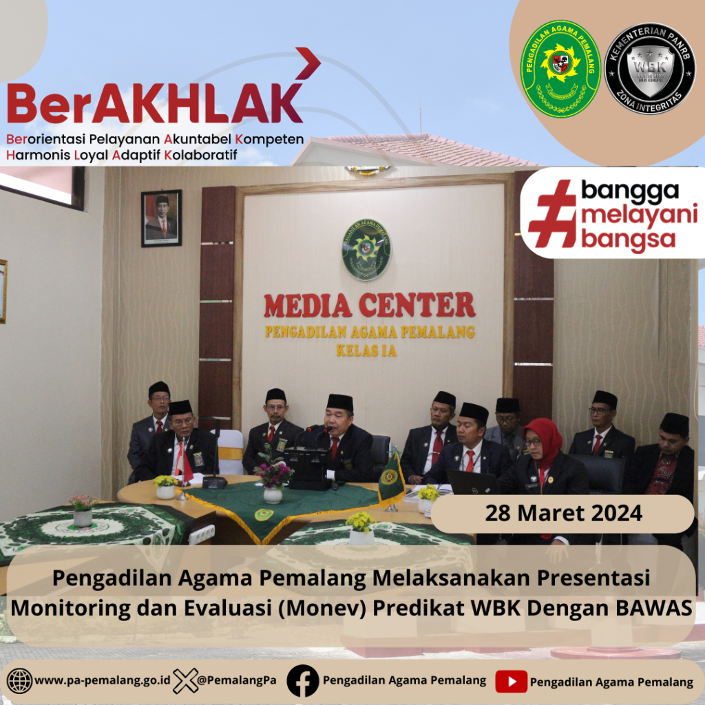 Pengadilan Agama Pemalang Melaksanakan Presentasi Monitoring dan Evaluasi (Monev) Predikat WBK Dengan BAWAS Kamis 28 Maret, Pengadilan Agama Pemalang melaksanakan presentasi monitoring dan evaluasi zona integritas dengan predikat WBK dihadapan Bawas. Ketua, Wakil Ketua, Panitera, Sekretaris dan seluruh Koordinator Area hadir bersama- sama di Media Center Pengadilan Agama Pemalang untuk mempresentasikan kondisi Pengadilan Agama […]
