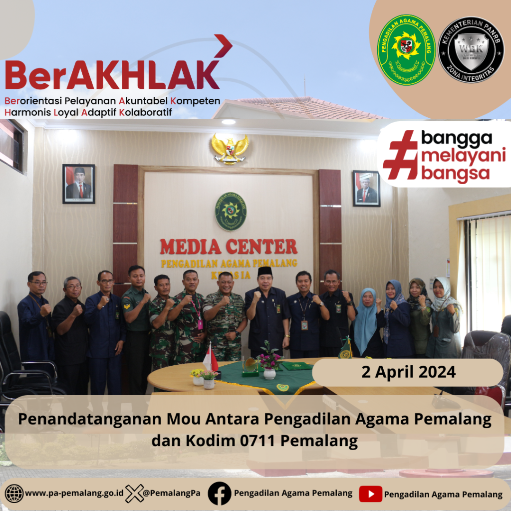Penandatanganan Mou Antara Pengadilan Agama Pemalang dan Kodim 0711 Pemalang Selasa, 2 April 2024 Bertempat di Media Center Pengadilan Agama Pemalang pukul 13.30 WIB dilaksanakan Penandatanganan Mou antara Pengadilan Agama Pemalang dengan Kodim 0711 Pemalang. Hadir dalam Acara Penandantangan Mou tersebut Ketua Pengadilan Agama Pemalang Solahuddin Sibagabariang, S.Ag.,M.H, Wakil ketua, Hakim,Sekretaris, Panitera, dan Perwakilan Pegawai […]