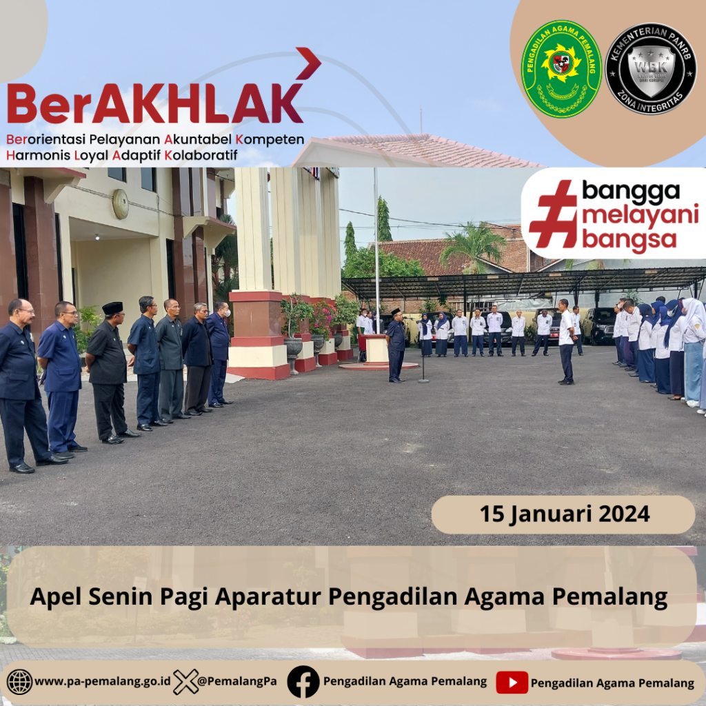 Apel Senin pagi Aparatur Pengadilan Agama Pemalang Apel Senin pagi Aparatur Pengadilan Agama Pemalang di Pimpin oleh Wakil Ketua Pengadilan Agama Pemalang Drs. Husaini, S.H.,M.H selaku Pembina Apel. Dalam Amanatnya beliau berpesan untuk tetap berdisiplin dalam melaksanaka setiap pekerjaan. Dan juga mengingatkan kepada Tim ZI untuk mempersiapkan kelengkapan data di tahun 2024 ini untuk memenuhi […]
