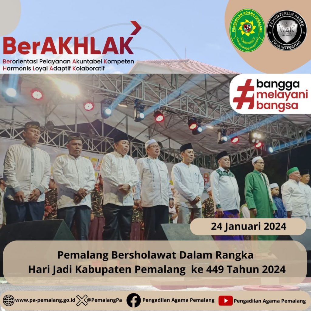 Pemalang Bersholawat dalam rangka Hari Jadi Kabupaten Pemalang ke 449 Tahun 2024 Pemalang. 24 Januari 2024 Ketua Pengadilan Agama Pemalang Solahuddin Sibagabariang, S.Ag.,M.H menghadiri Acara Pemalang Bersholawat dalam rangka Hari Jadi Kabupaten Pemalang ke 449 Tahun 2024 di Alun-Alun Kabupaten Pemalang