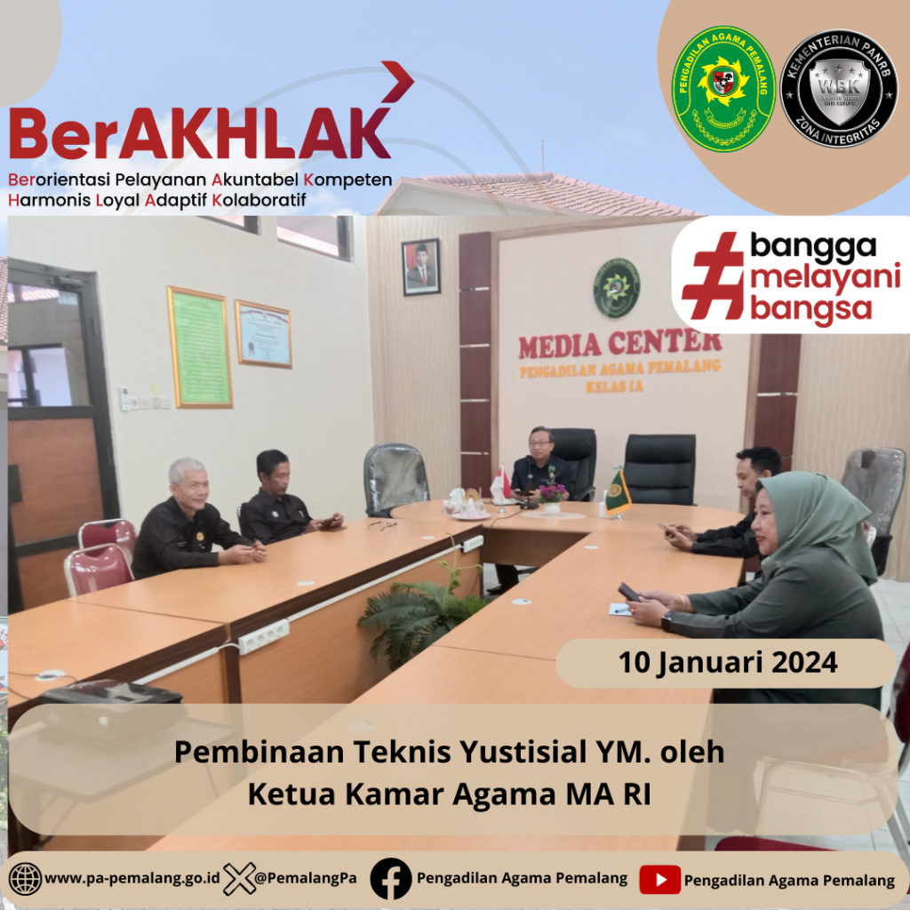 Pembinaan Teknis Yustisial YM. oleh Ketua Kamar Agama MA RI Pemalang, 10 Januari 2024 Bertempat di Media Center Pengadilan Agama, Wakil Ketua, Hakim dan Panitera Muda Pengadilan Agama Pemalang Mengikuti Pembinaan Teknis Yustisial YM. oleh Ketua Kamar Agama MA RI Prof. Dr. Drs. H. Amran Suadi, S.H.,M.Hum.,M.M #BersatuKitaKuatBersamaKitaHebat#mahkamahagung#pelayananpublik#reformasibirokrasi#zonaintegritas#integritasdarihati#wbkwbbm @rbkunwas@humasmahkamahagung@ditjen.badilag@ptasemarang Informasi seputar Pengadilan Agama […]