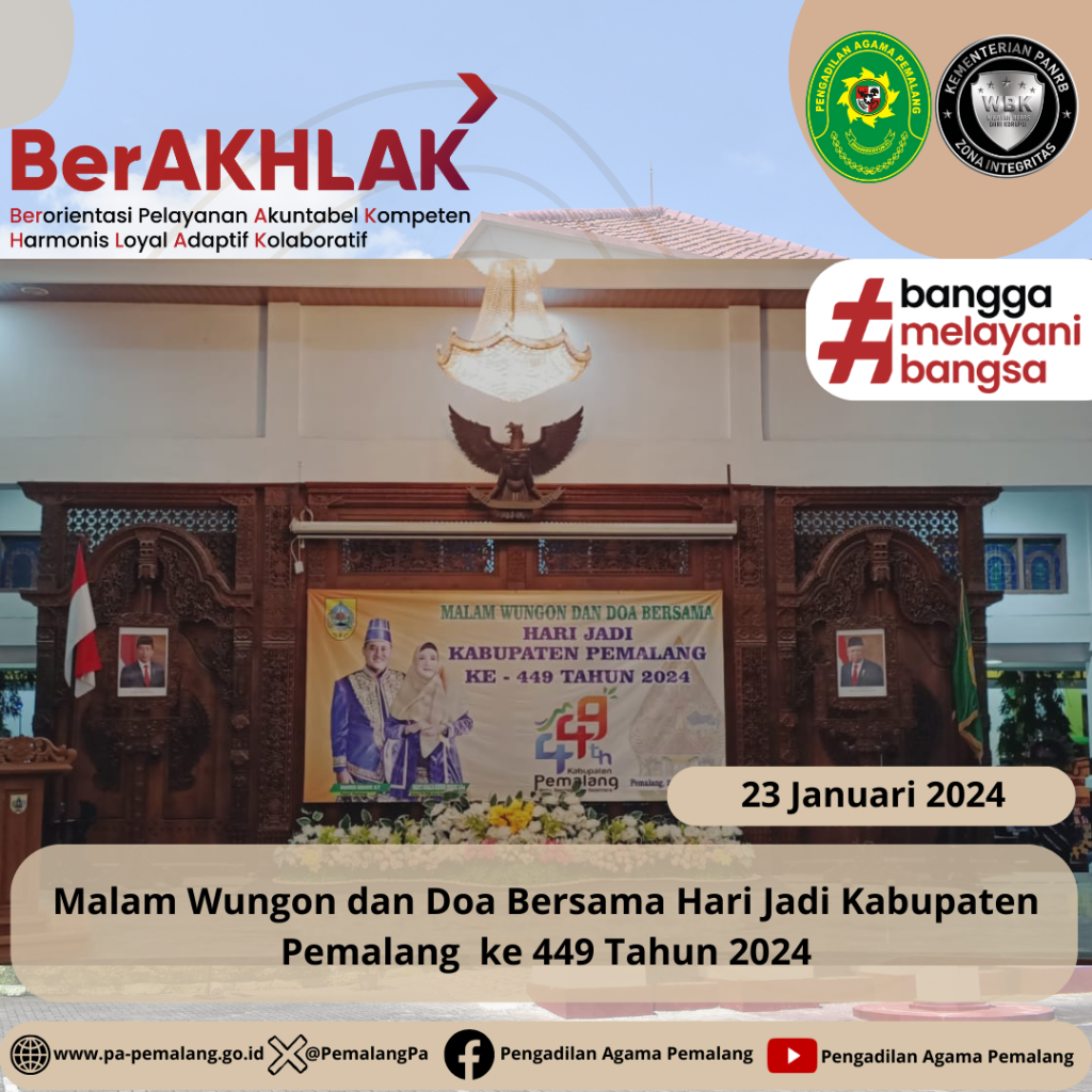 Kegiatan Malam Wungon dan Doa Bersama Hari Jadi Kabupaten Pemalang ke 449 Tahun 2024 Pemalang. 23 Januari 2024 Ketua Pengadilan Agama Pemalang Solahuddin Sibagabariang, S.Ag.,M.H menghadiri undangan Kegiatan Malam Wungon dan Doa Bersama Hari Jadi Kabupaten Pemalang ke 449 Tahun 2024 di Pendopo Kabupaten Pemalang.