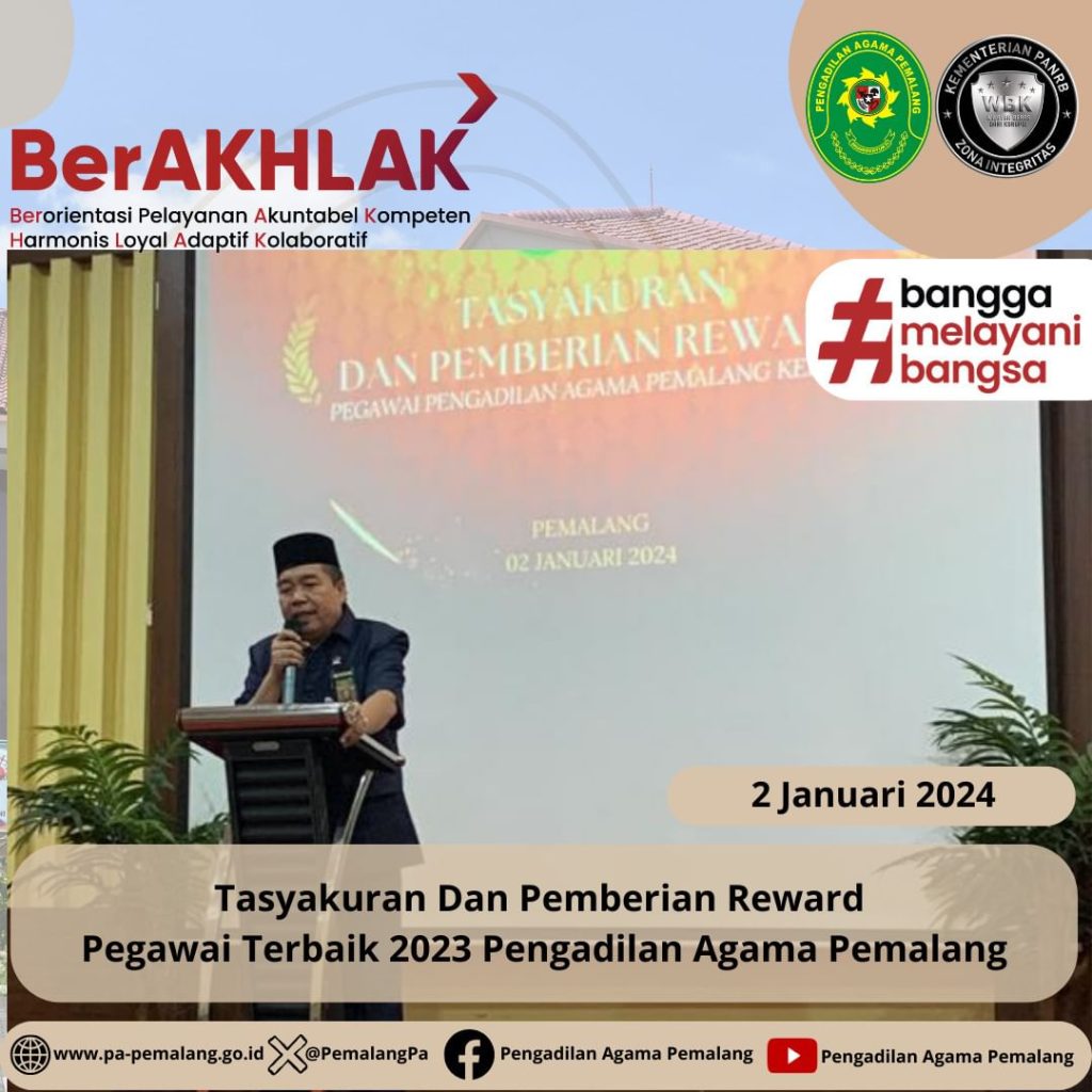 Tasyakuran Dan Pemberian Reward Pegawai Terbaik 2023 Pengadilan Agama Pemalang Pemalang, 2 Januari 2024 Mengawali Awal Tahun 2024, Bertempat di Ruang Sidang Utama Abu Bakar Ash Shidiq Pengadilan Agama Pemalang pukul 12.30 di adakan Acara Tasyakuran dan Pemberian Reward Kepada Pegawai terbaik. Acara di buka dengan doa bersama yang di pimpin oleh Drs.H. Mohammad Taufik, […]
