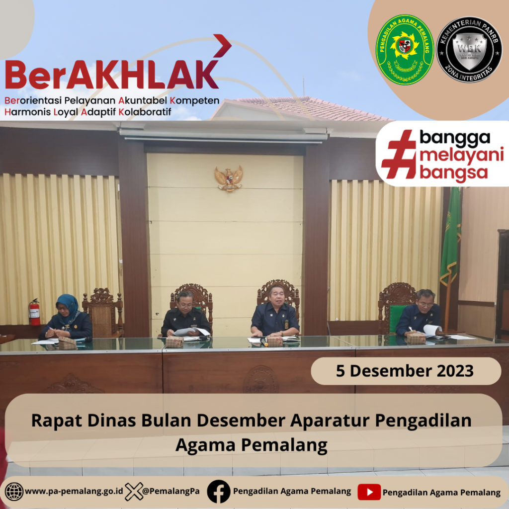 Rapat Dinas Bulan Desember Pemalang, 5 Desember 2023 Bertempat di Ruang Sidang Utama Abu Bakar Ash Shidiq pukul 13.30 di adakan rapat dinas bulan Desember Aparatur Pengadilan Agama Pemalang.Dalam Rapat dinas Bulan ini Ketua Pengadilan Agama Pemalang Solahuddin Sibagabariang, S.Ag.,M.H mengingatkan kembali bahwa ini sudah di penghujung tahun 2023, dimana harus mempersiapkan untuk Laporan Tahunan, […]