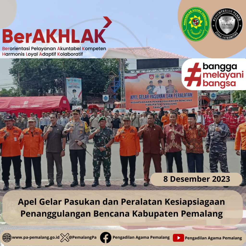 Apel Gelar Pasukan dan Peralatan Kesiapsiagaan Penanggulangan Bencana Kabupaten Pemalang Tahun 2023 Pemalang, 8 November 2023 Ketua Pengadilan Agama Pemalang Solahuddin Sibagabariang, S.Ag.,M.H menghadiri Apel Gelar Pasukan dan Peralatan Kesiapsiagaan Penanggulangan Bencana Kabupaten Pemalang Tahun 2023 di Alun Alun Kabupaten Pemalang.