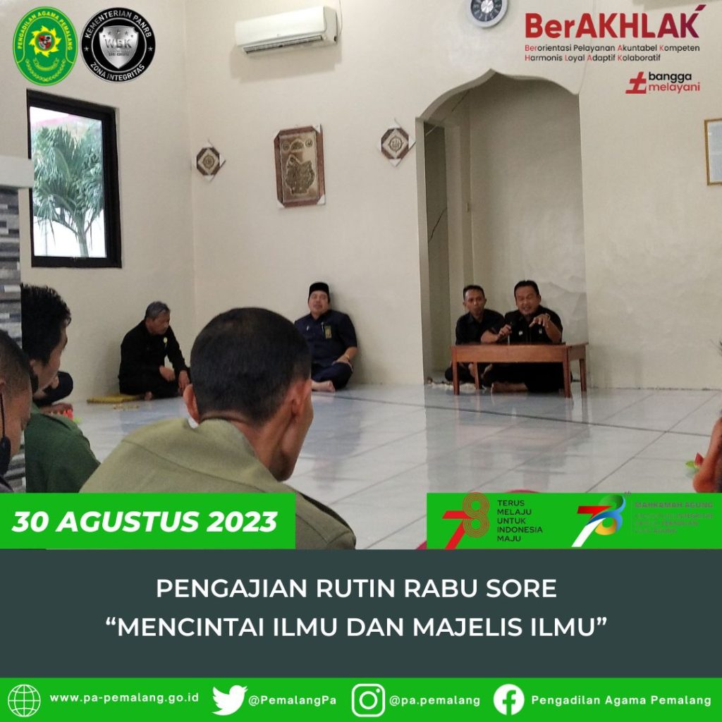 Pengajian Rutin Rabu Sore Pemalang 30 Agustus 2023 Pengajian Rutin Rabu Sore di Mushola Al Mahkamah kali ini di isi oleh Hakim Pengadilan Agama Pemalang Drs. H. Abd. Hamid, S.H.,M.H yang mengambil Tema tentang bagaimana kita mencintai ilmu dan juga mencintai majelis ilmu untuk bekal kita dalam menjalani kehidupan agar menjadi mukmin yang […]