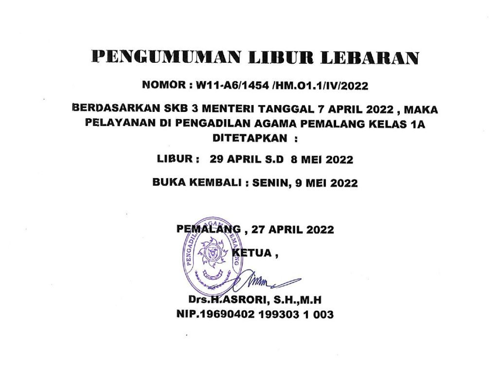 Pengumuman Cuti Bersama & Libur Lebaran Pengadilan Agama Pemalang Kelas 1A Tahun 2022