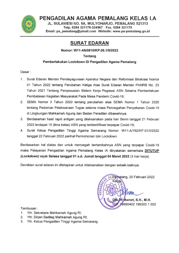 PEMBERLAKUKAN LOCKDOWN DI PENGADILAN AGAMA PEMALANG